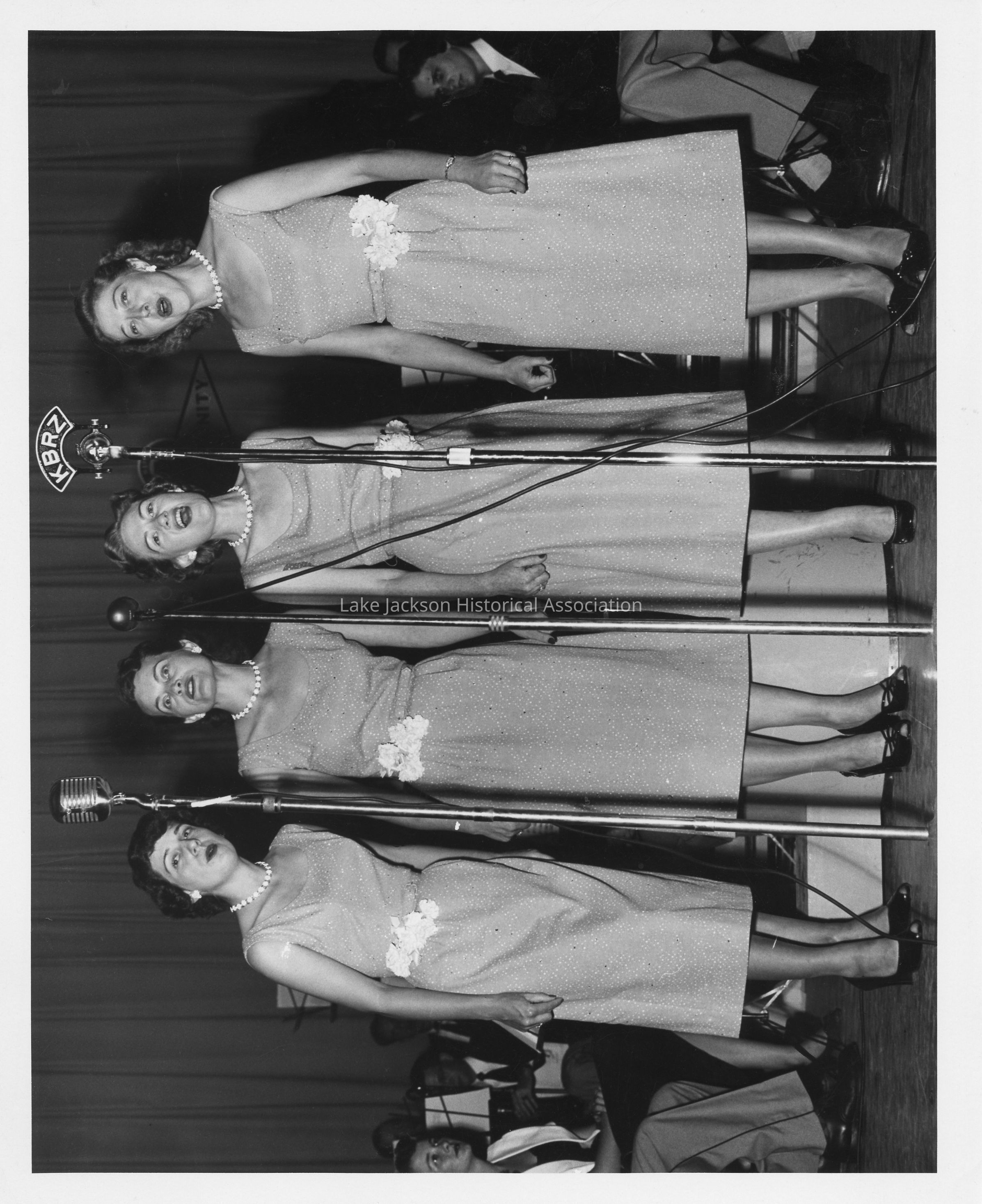 A black & white photo of four ladies and Dow Chorus singing on the radio. Back of picture reads: "Dow Chorus on radio KBRZ 1953Collection
