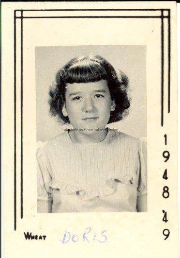 Black and white school picture of Doris Riggan. Handwritten in blue ink at the bottom is "Doris". At the lower left is "Wheat ". Along the lower part of the right margin is printed vertically "1948 '49". A double line border surrounds the picture.