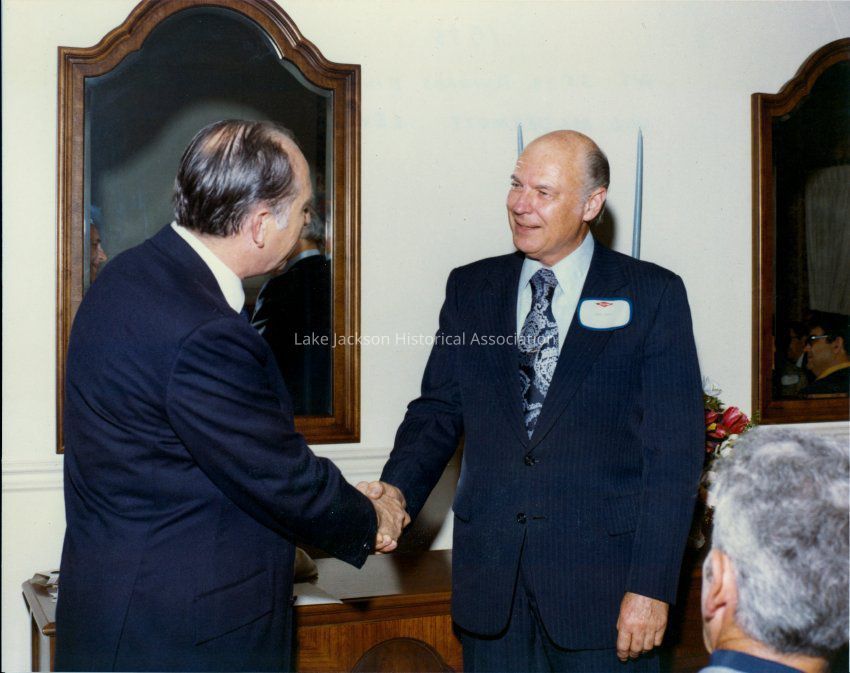 Picture showing L.H. Sumlin shaking hands with W.L. McDermott. The two men are shown almost full-length and standing in front of a wall mirror.