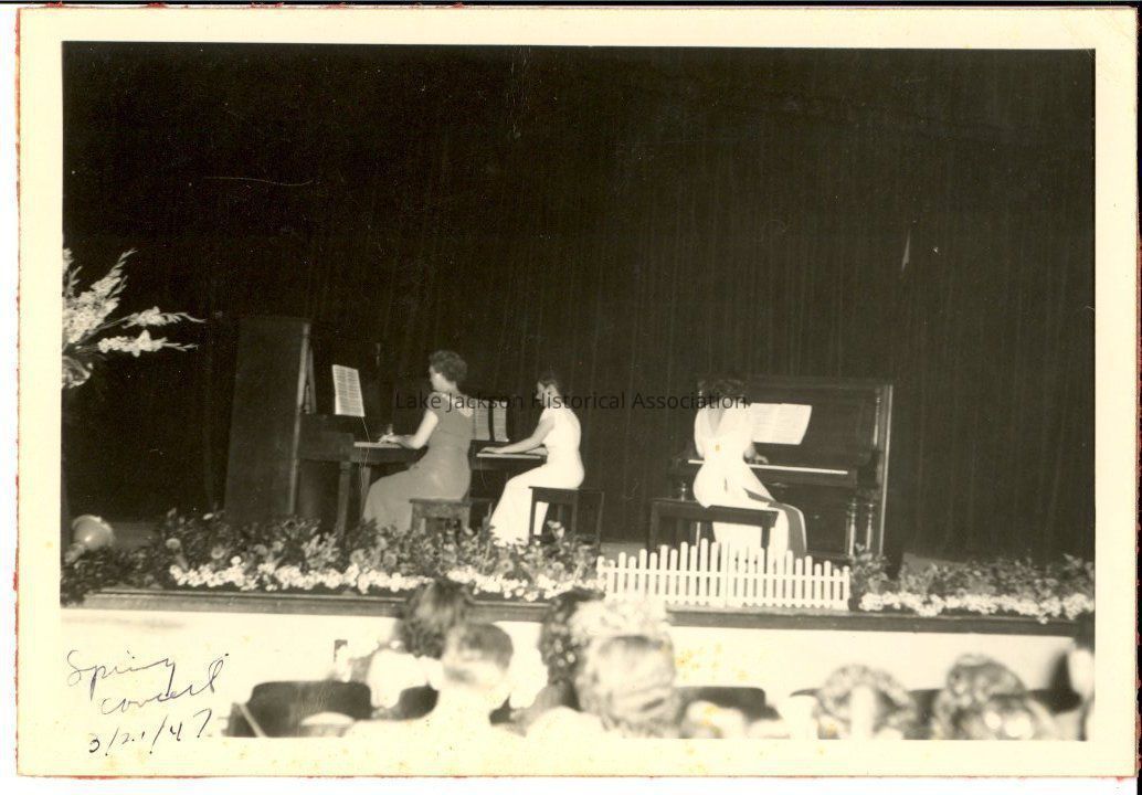 A black & white photo of 3 pianists on stage. The caption reads: "Spring Concert 3/21/47".Collection