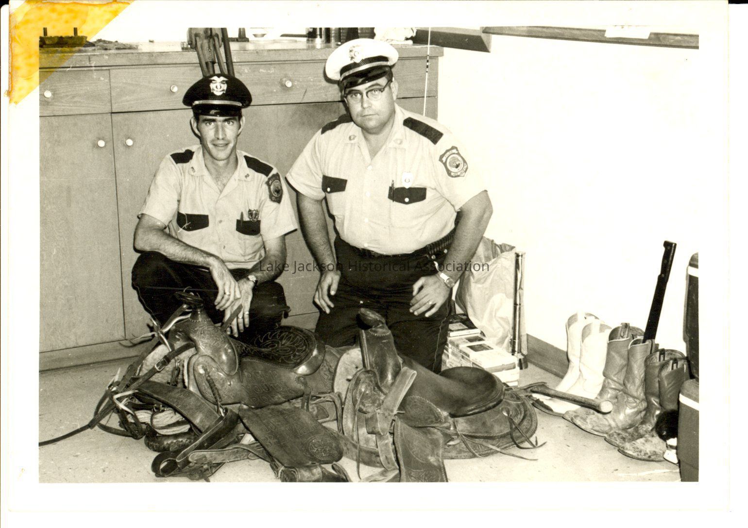 Black and white photo of two policemen with saddles and boots in their possessionCollection
