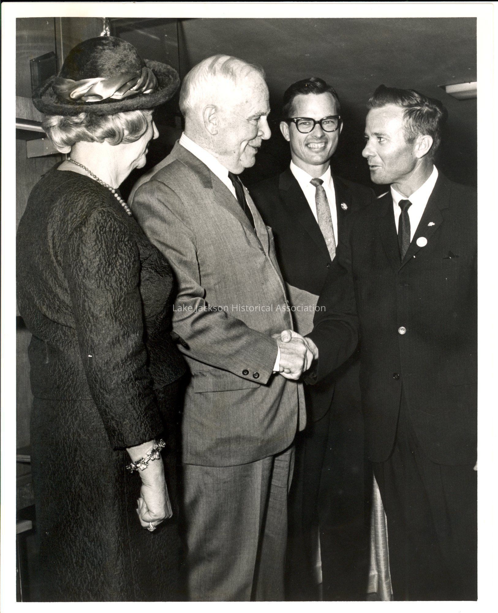 Black and white photo of two men shaking hands with a woman in the foreground and a man in the background.Collection