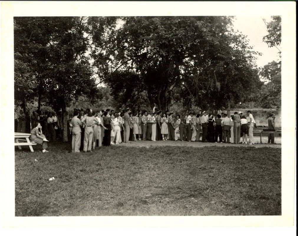 A black & white photo of some men & women at Dow Lake party. They appear to be lined up, possibly in a food line.Collection