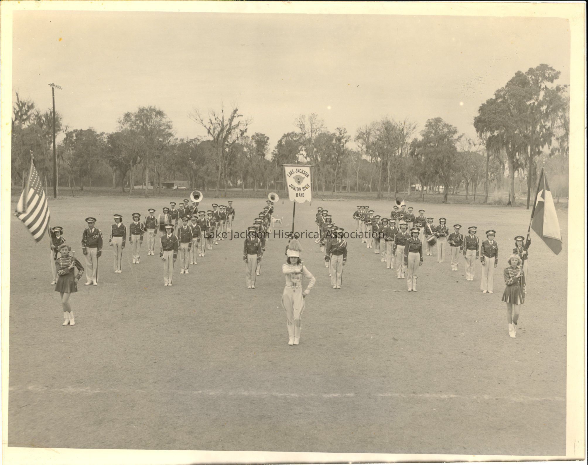 Black and white photograph of the Lake Jackson Junior High School band posed in uniforms on the field.