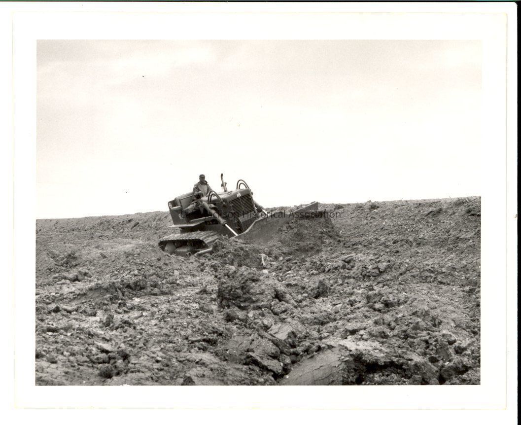 A black & white photo of a Dow Chemical employee using a machine to scrape or dig a ditch on January 7, 1957.Collection