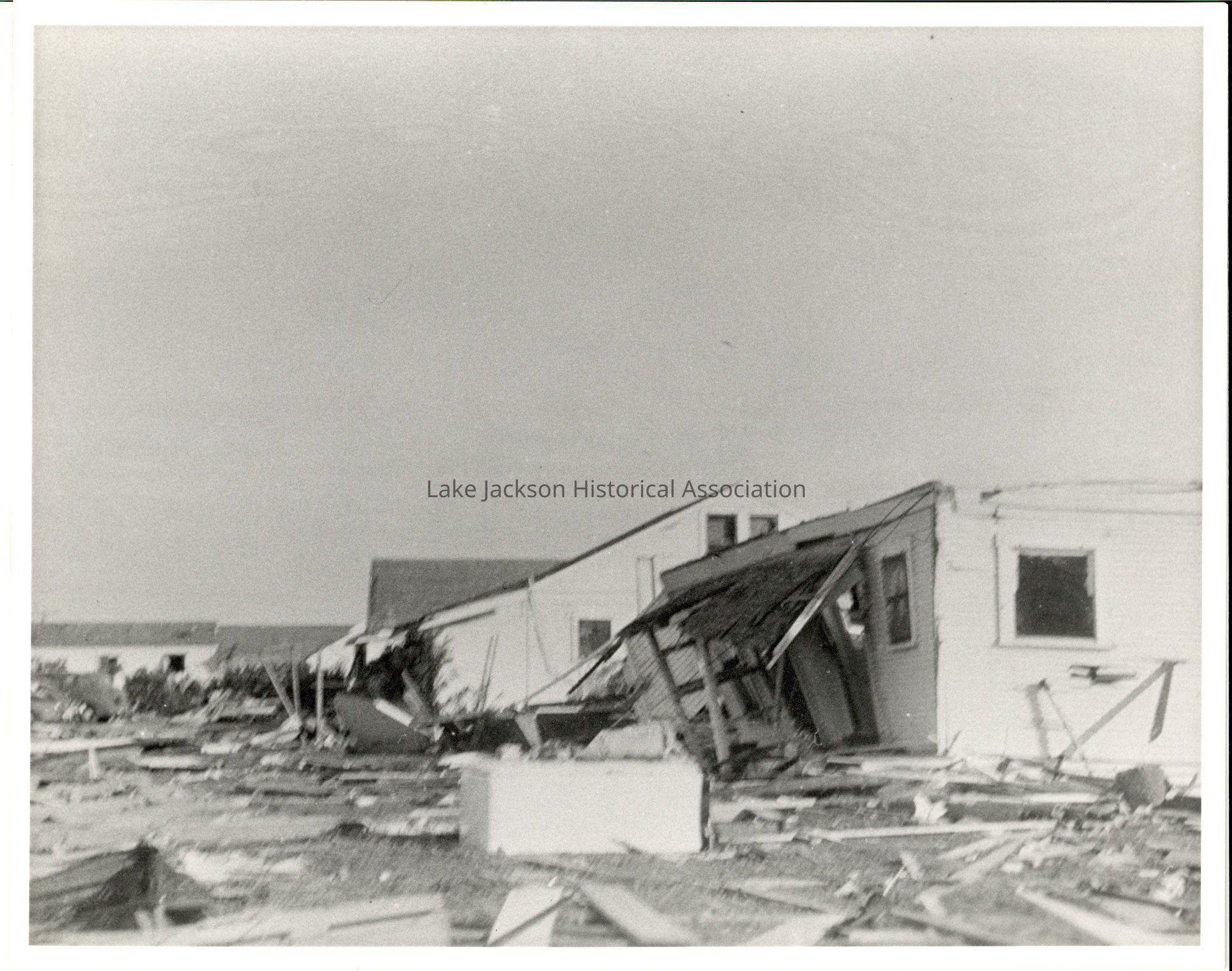 B/W Photo of the 1943 Freeport Tornado. A view of several damaged buildings.Collection