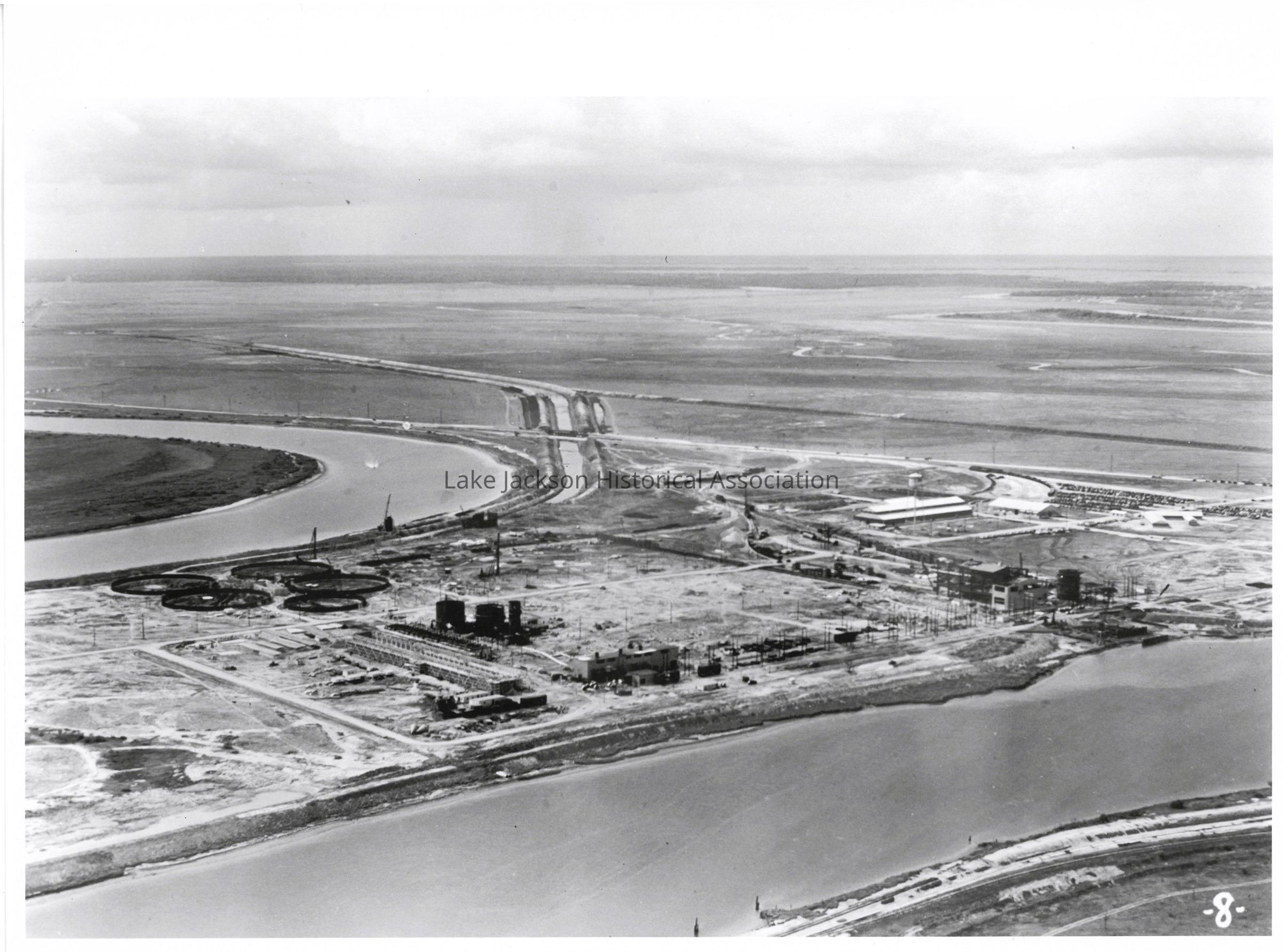 Aerial view of the Dow Chemical Company magnesium plant, Plant A in Freeport, Texas, early 1940. In this picture the barracks and lunch hall are located near the top of the peninsula. The dorr tanks (large circular structures) can be seen in the center with the magnesium cells next to the dorr tanks.Collection