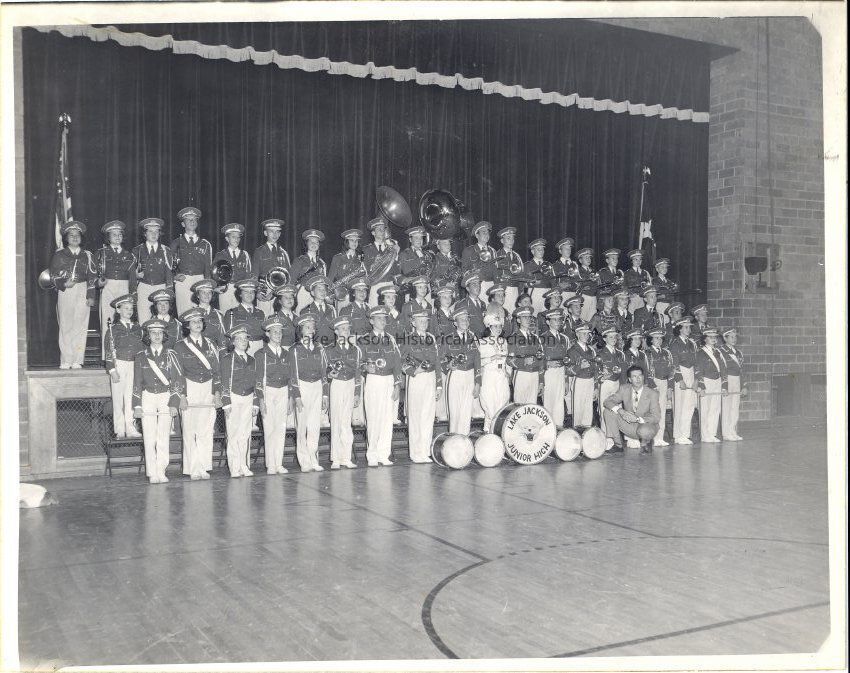 Black and white photograph of the Lake Jackson Junior High School band standing in a gym next to a stage. Grant Scoggins is kneeling in front. It is similar to 2003.12.13 but shows more of the gym.Collection