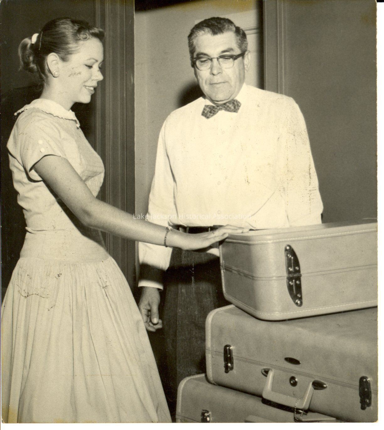 Black and white photo of a young girl and a man standing by a stack of suitcases.Collection