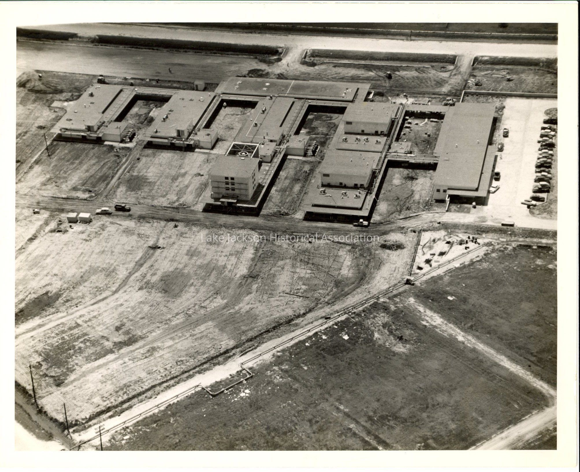 A black & white photo of an aerial view of the Dow research center under construction in Freeport.Collection