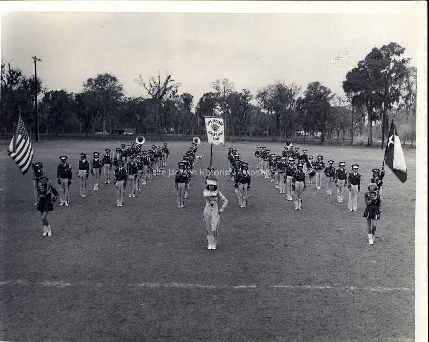 Black and white photograph of the Lake Jackson Junior High School band in formation on the field.