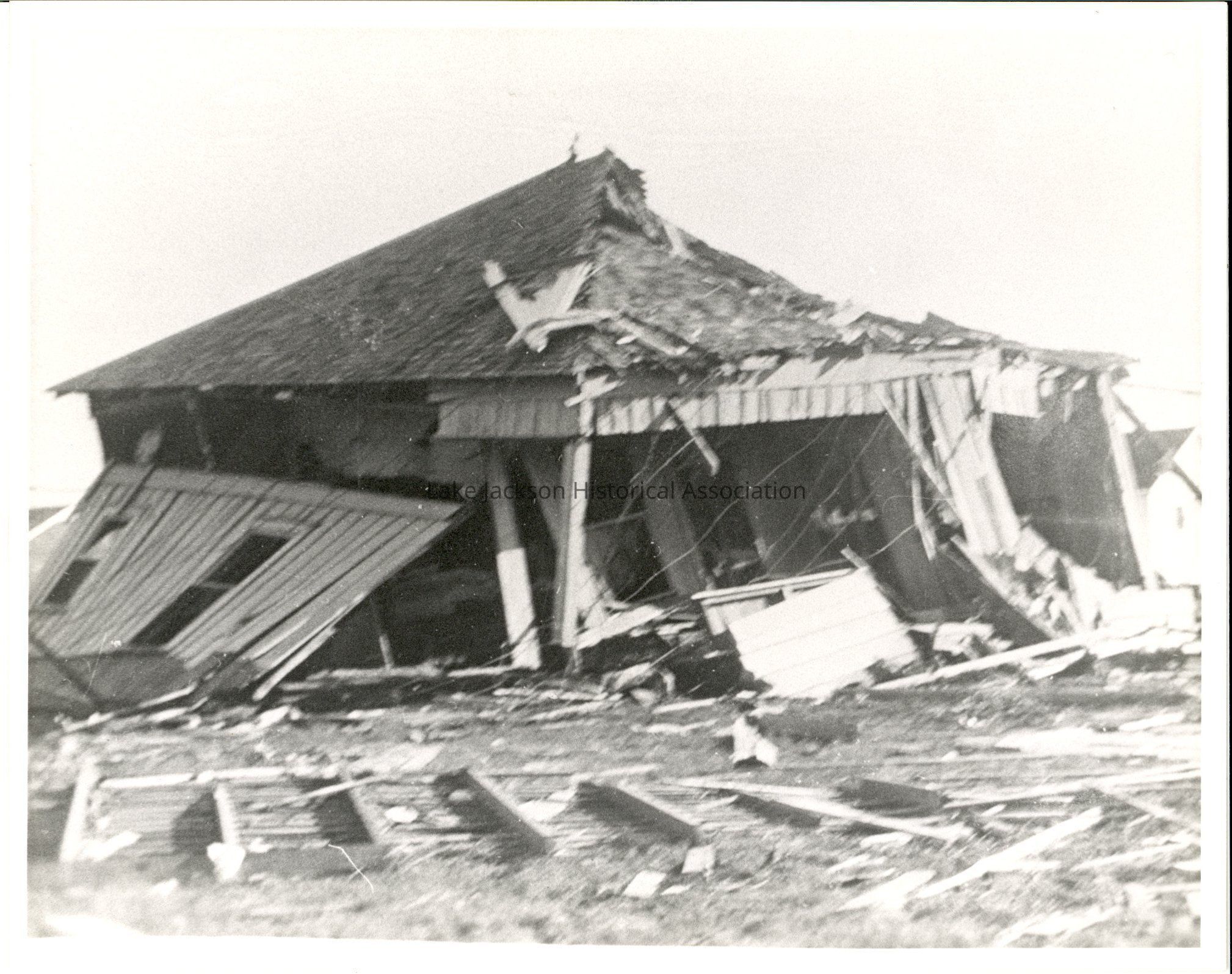 B/W Photo of a damaged building during the 1943 Freeport Tornado.Collection
