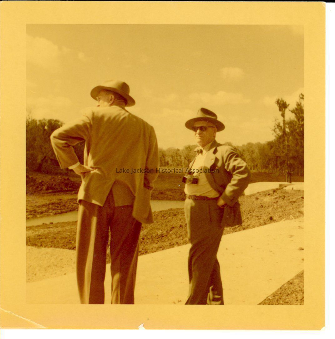 Black and white photo of Dr. Beutel and another man outside at Dow entering the Levee Water Canal.Collection