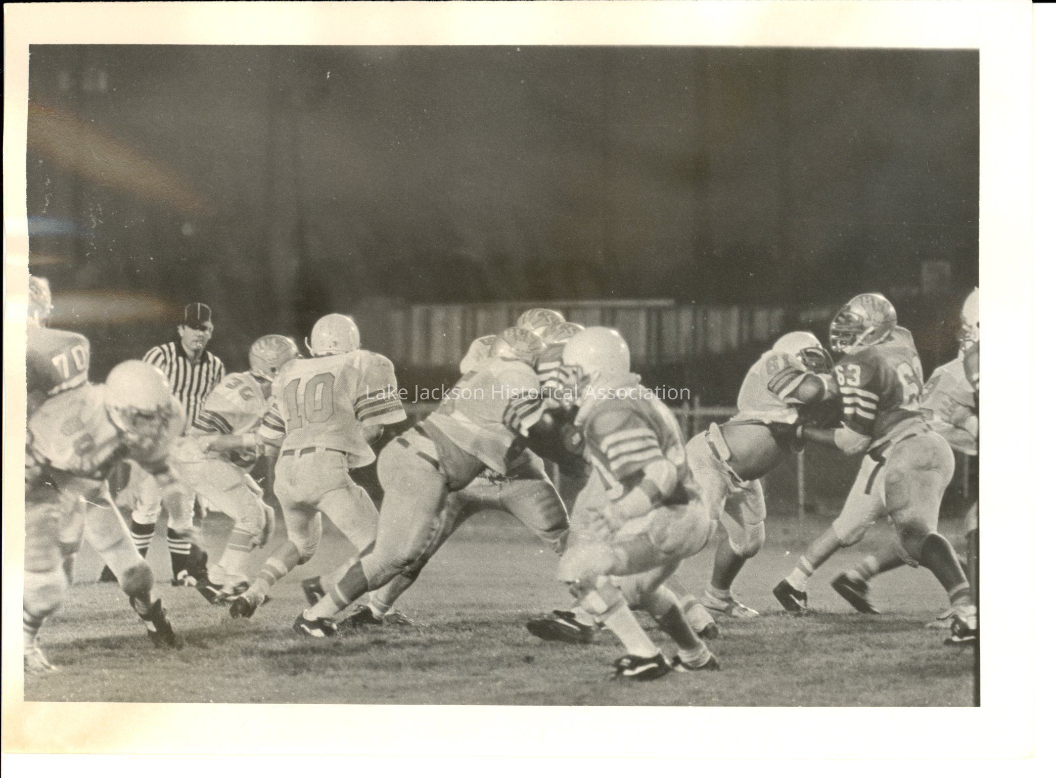 Black and white photo of a football team playing a game.