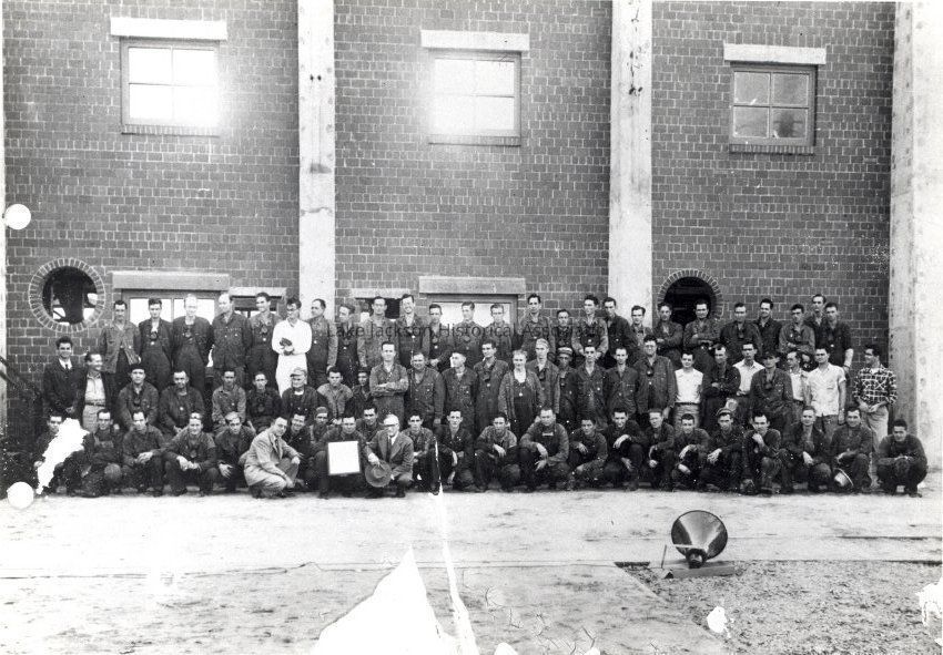 Black and white picture of a department taken with a brick building as a backdrop. Dr. A.P. Beutel is in the front, toward the center. The place is not identified. There is no date.