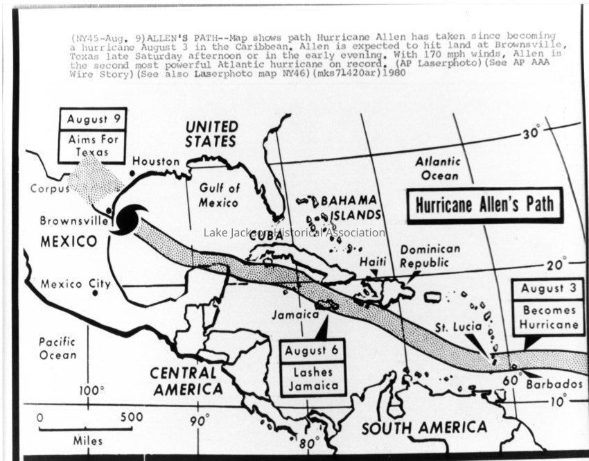 B/W Photo of a map during Hurricane Allen 1980. The map shows the path that Hurricane Allen had taken since becoming a hurricane on August 3 in the Caribbean. With 170 mph winds, Allen is the second most powerful hurricane on record.Collection