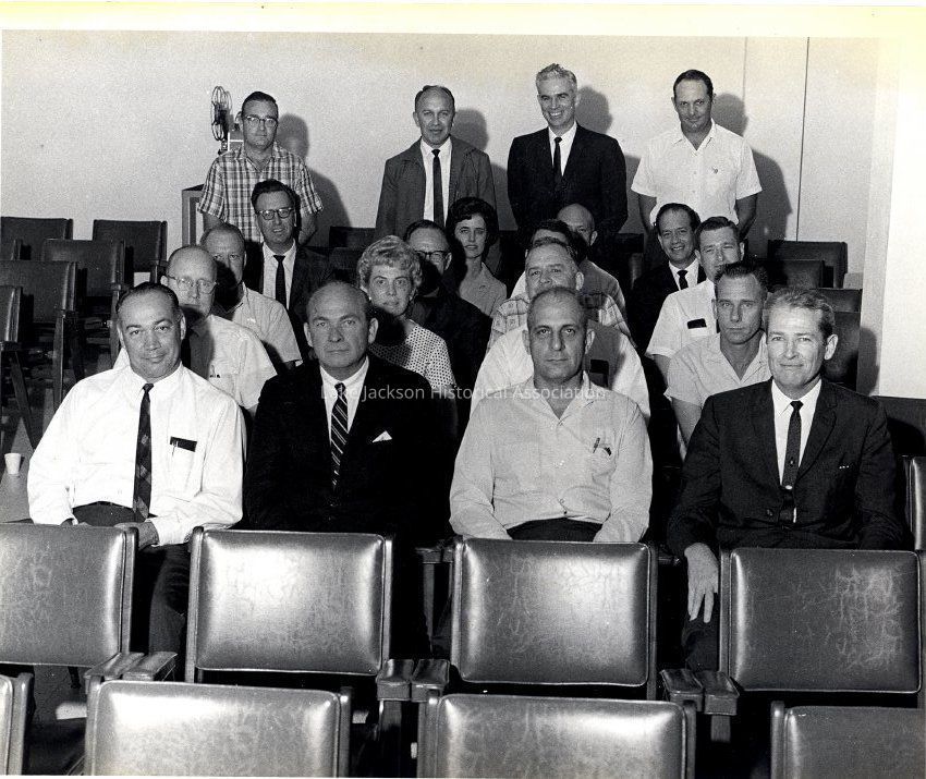 Black and white photograph of 20 people in a conference room. There are four rows of seated employees, and the fifth row is standing. No identification of any person is given.