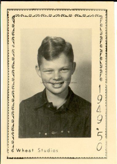 Black and white school picture of an unknown male student. At the lower left is "Wheat Studios". Along the lower part of the right margin is printed vertically "1949 '50". A decorative border surrounds the picture.Collection