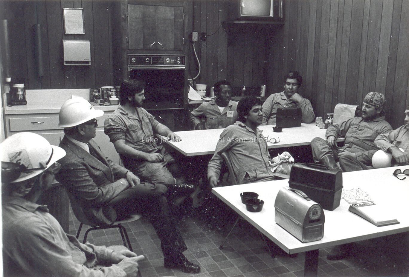 The photograph shows eight men in the lunch/break room.