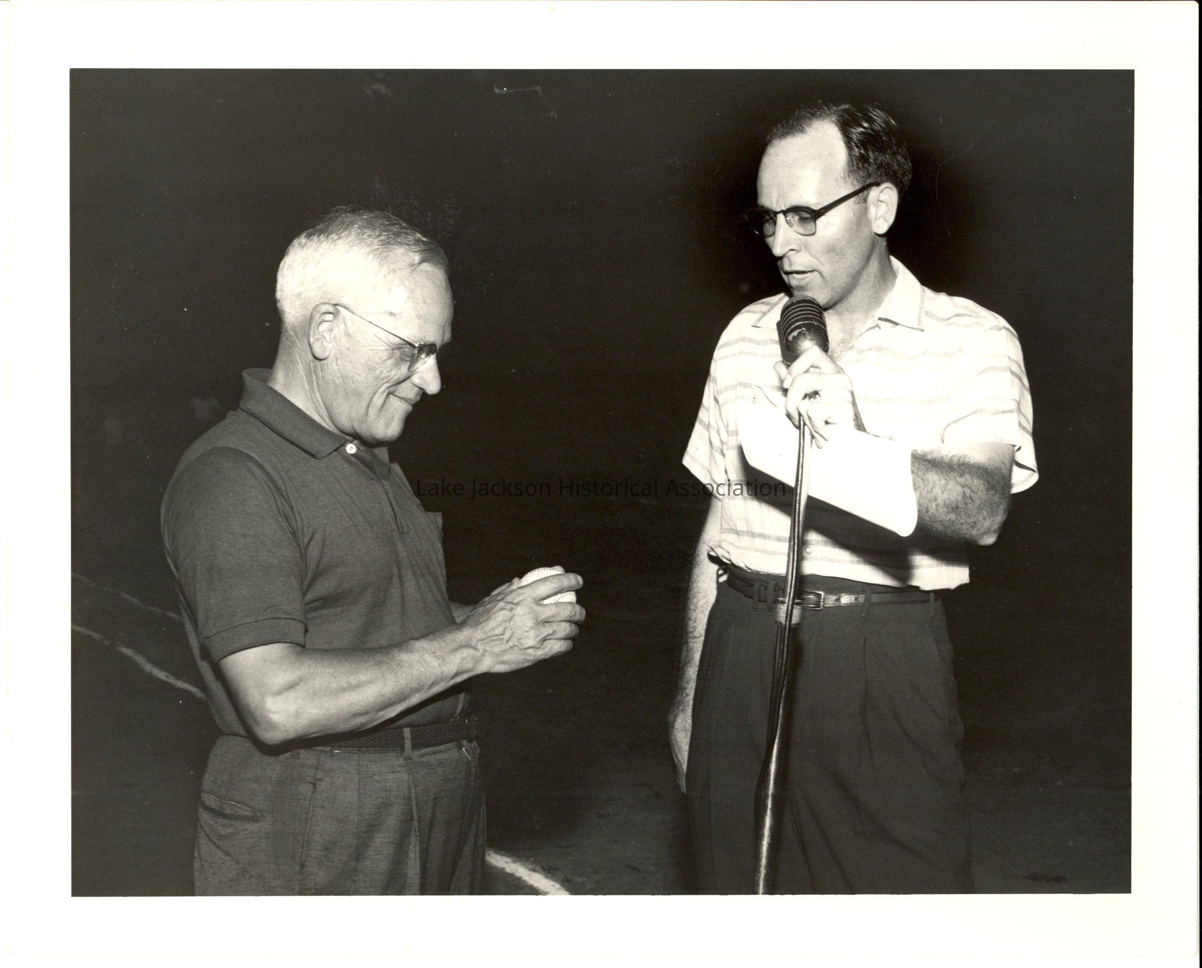 1- Black and white photo of Dr. Beutel holding a baseball and Mac Pruitt at a microphone.Collection