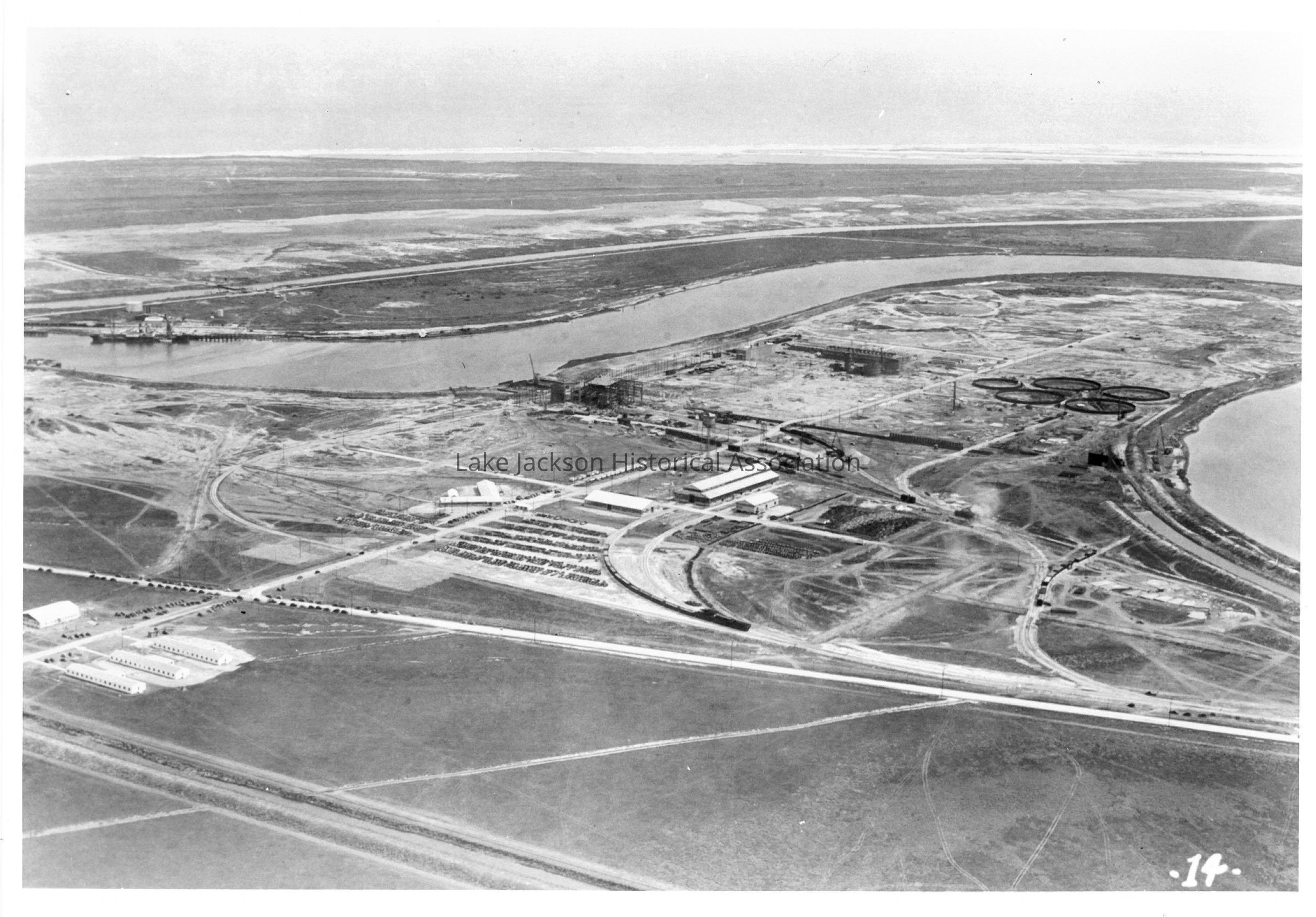 Aerial view of the Dow Chemical Company magnesium plant, Plant A in Freeport, Texas, early 1940. In this picture the barracks and lunch hall can be seen near the bottom. The dorr tanks/ponds (large circular structures) can be seen to the right with the magnesium cells on the left.Collection