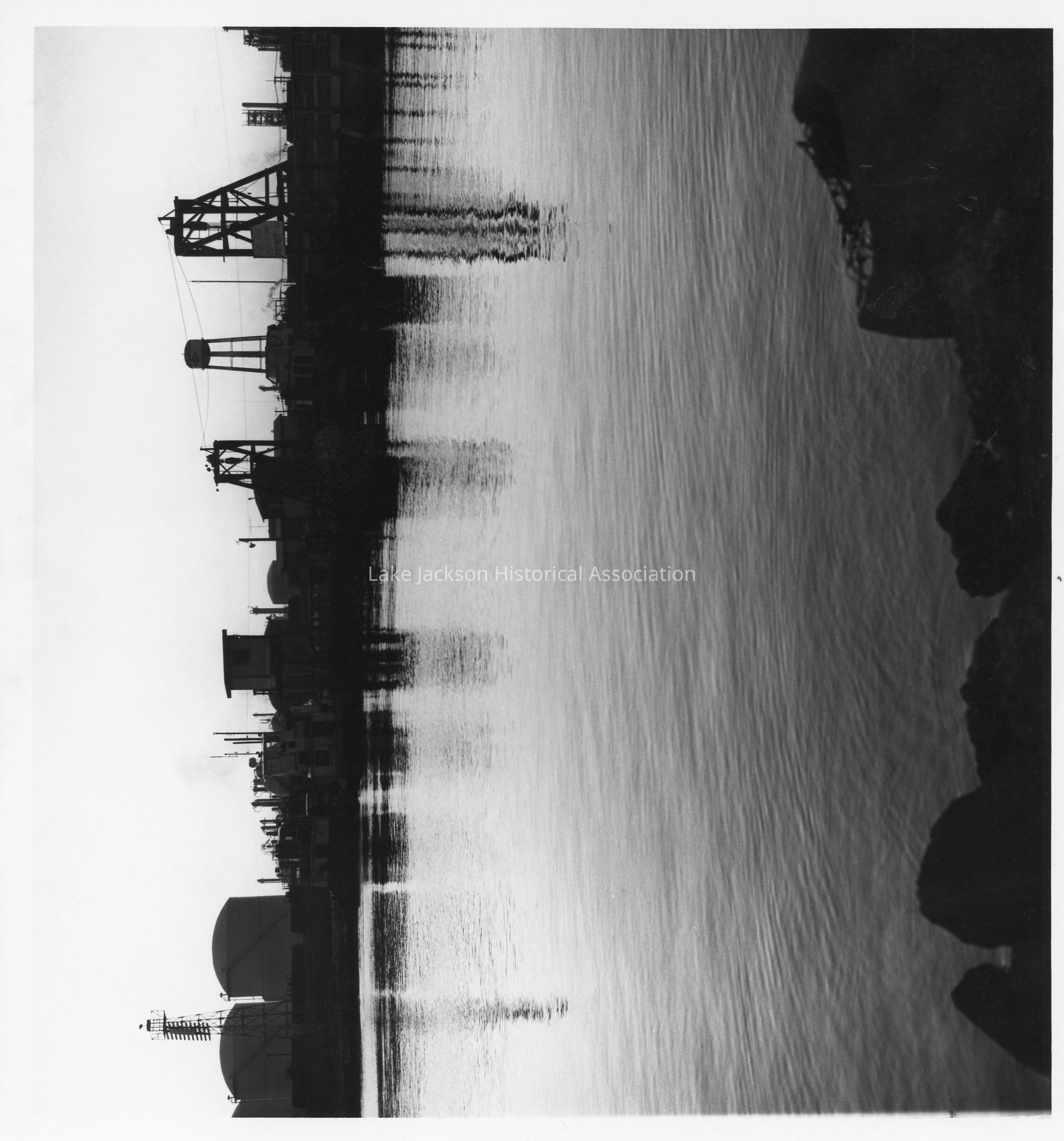 B/W photo of the Brazos River lighthouse deconstruction. A water view of Dow Chemical.Collection