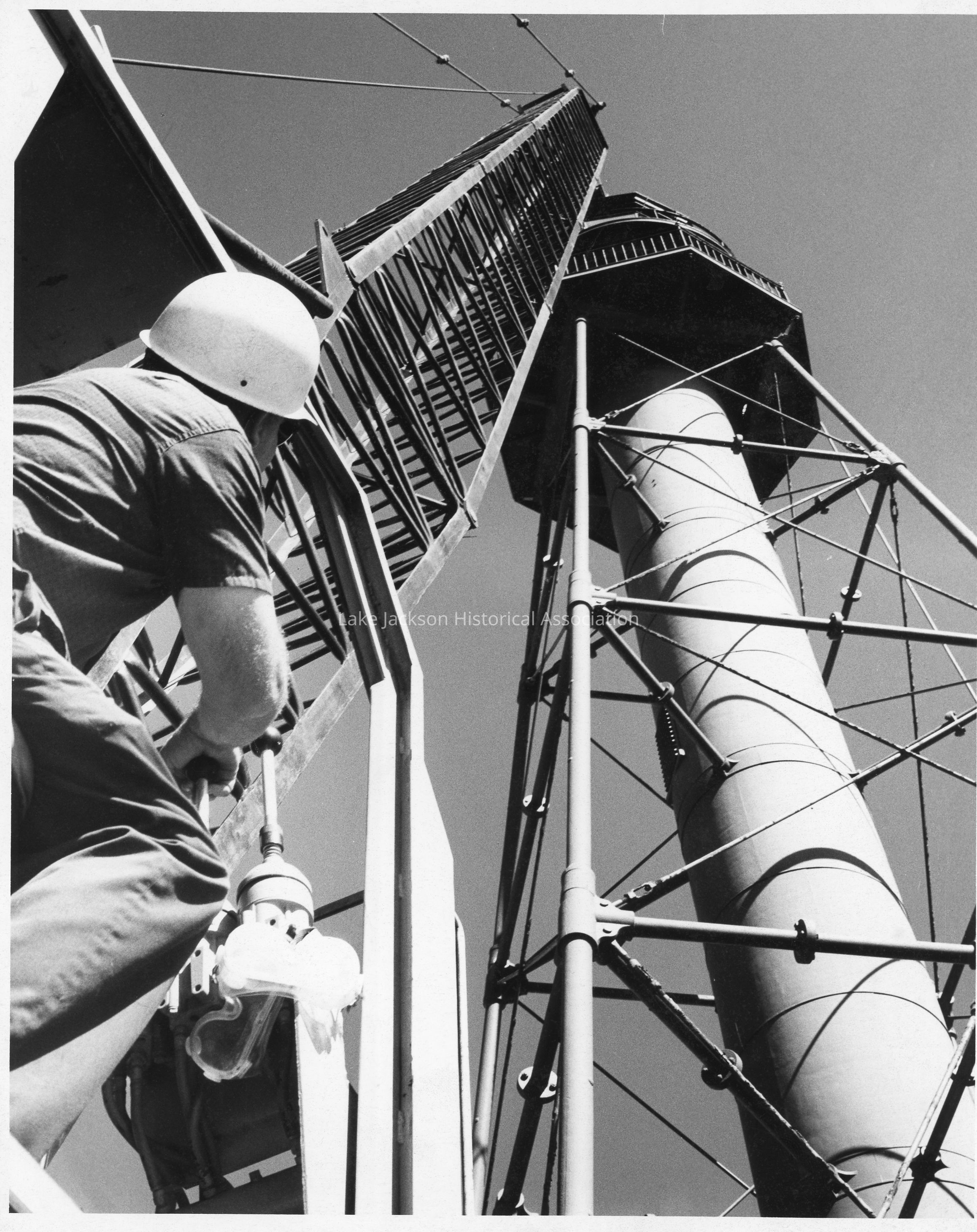 B/W photo of the Brazos River lighthouse deconstruction.