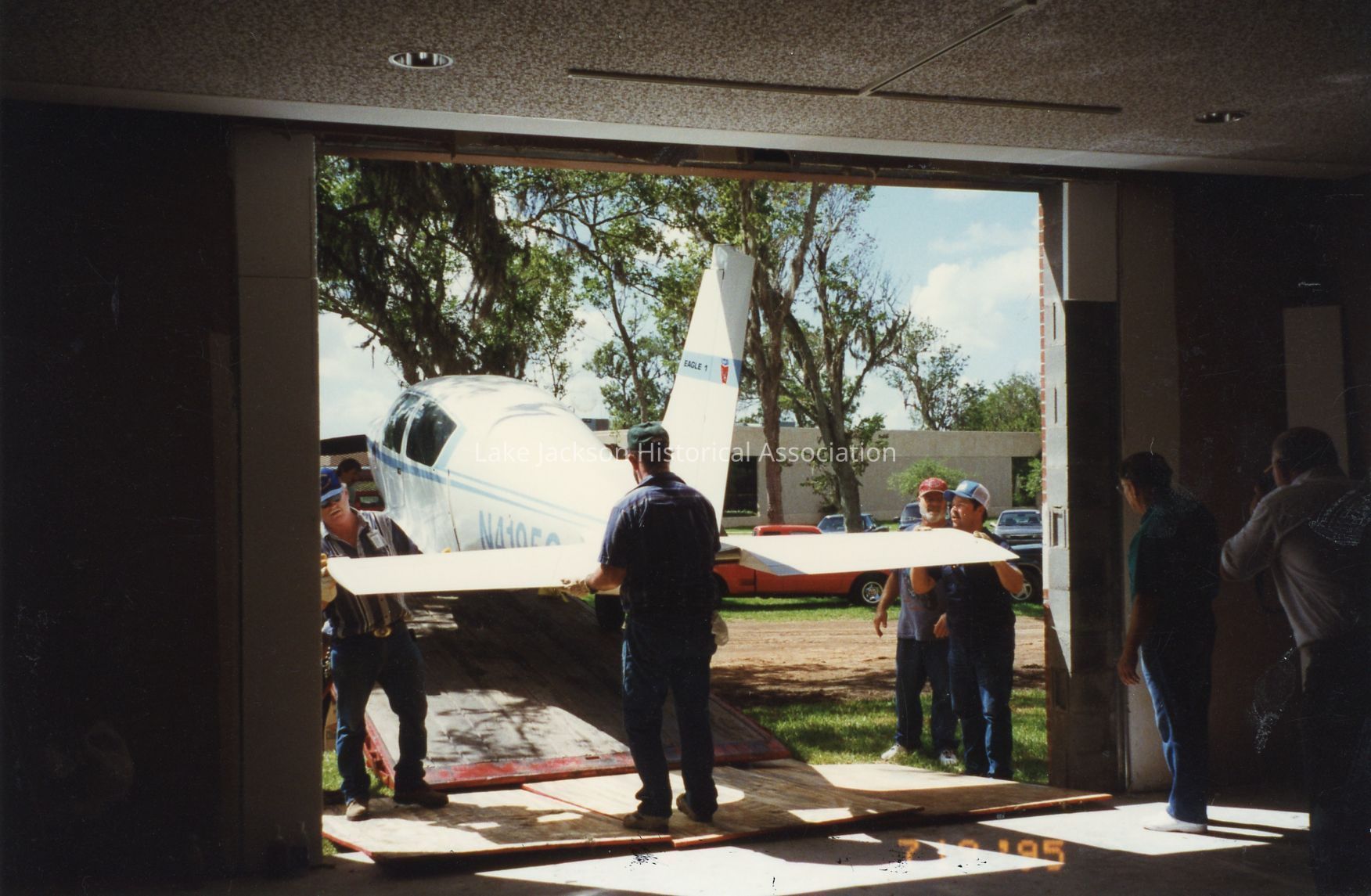 Color photo of men unloading the Windecker Eagle from a semi-truck. The photo was taken from inside the museum building.Collection