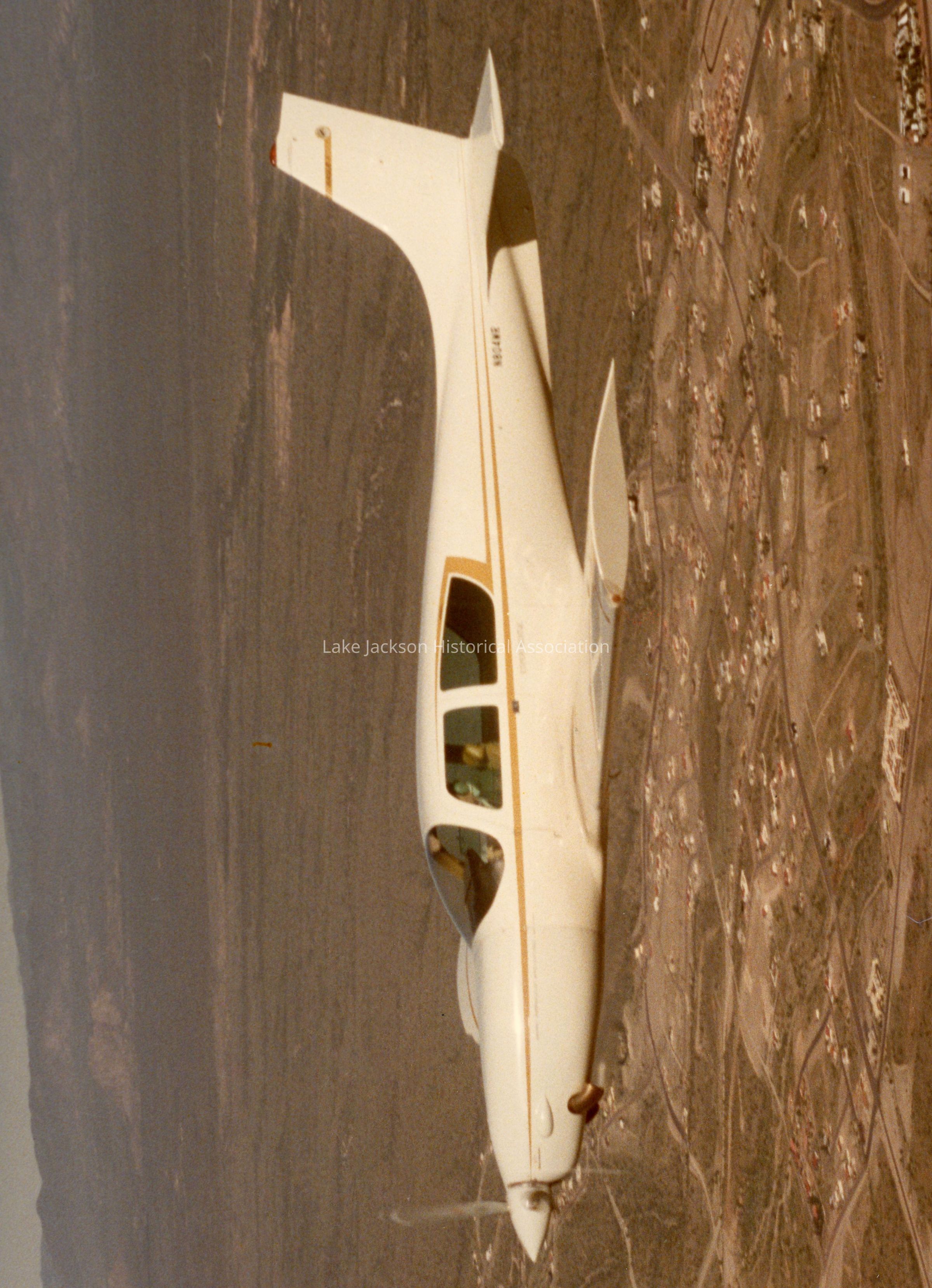 Color photo of the N804WR Windecker Eagle. The plane shown in flight is white with harvest yellow gold stripes.Collection