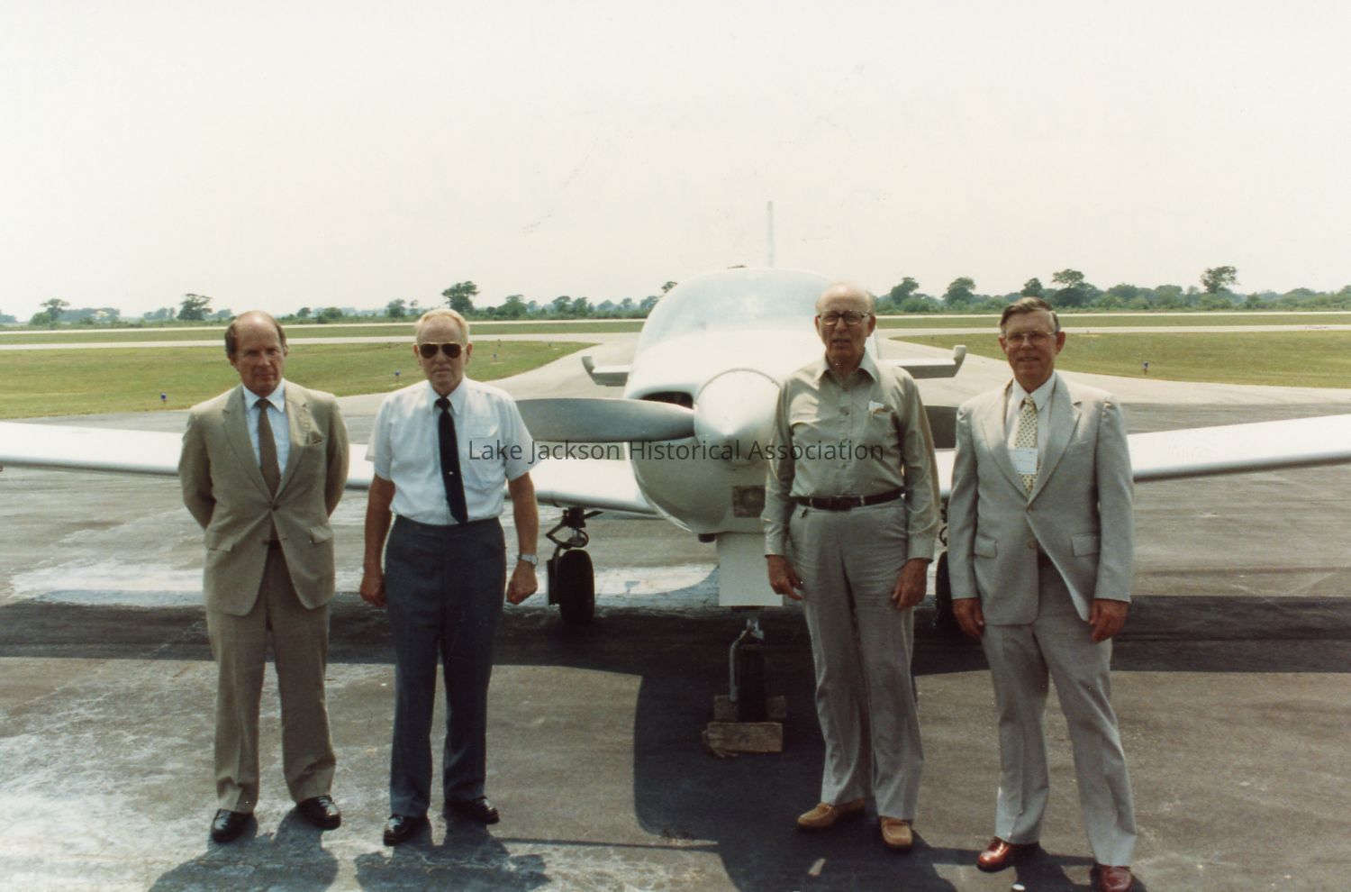 Color photo of Windecker Eagle (N4195G). Group photo from left to right: Bill Blakemore, Mike McMichaels, Mac Pruitt, and Cal Stoner.Collection