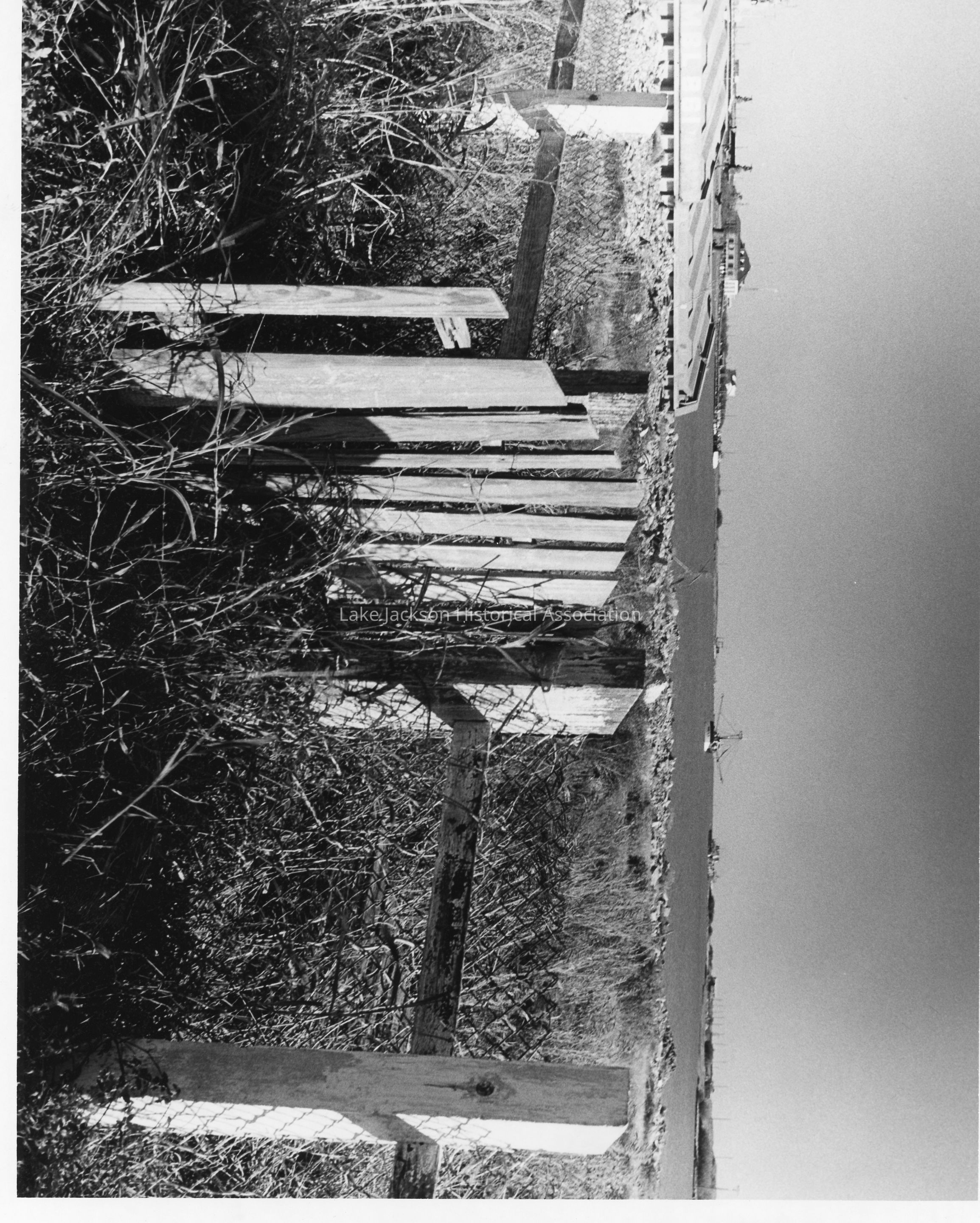 B/W photo of the Brazos River lighthouse deconstruction. A view of the front gate.Collection