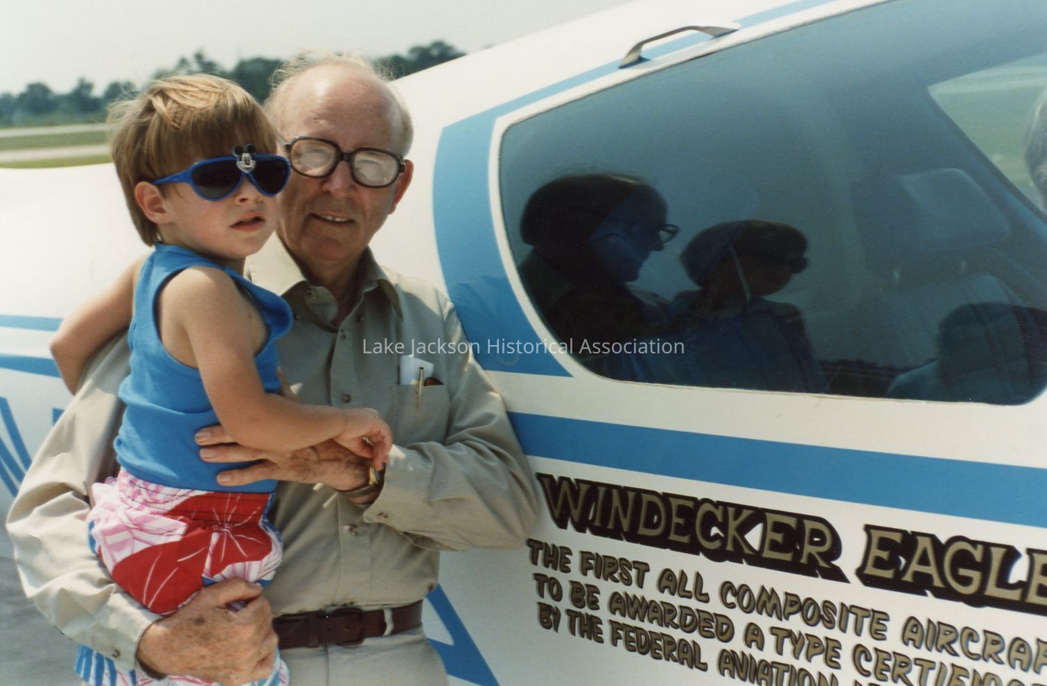 Color photo of Mac Pruitt and his great grandchild, Travis, inspecting the Windecker Eagle (N4195G).Collection