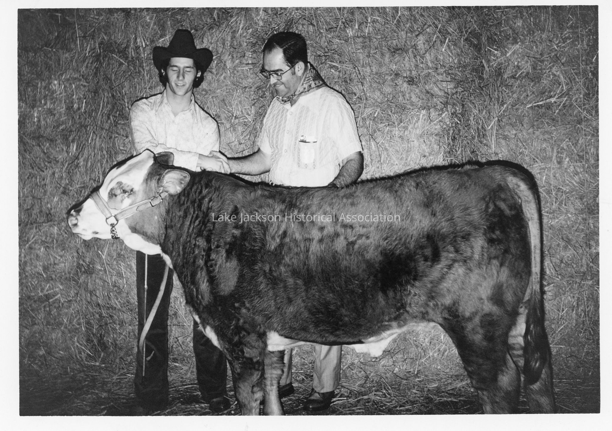 A black & white photo of David Rooke standing with the Brazoria County Fair Grand Champion and the young man who raised him. The back of the photo reads: "Dow buys grand champion--David Rooke 70s".Collection