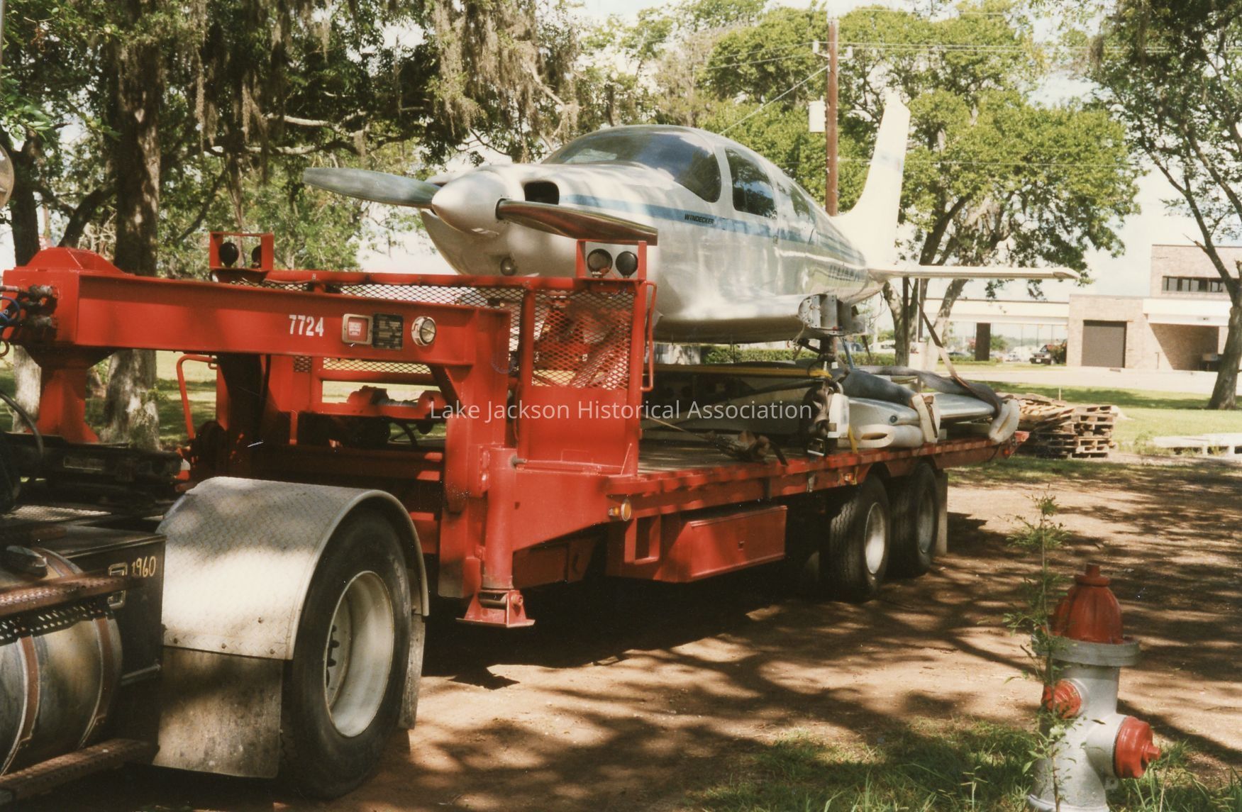 Color photo of the Windecker Eagle being transported onto Museum property aboard a flatbed trailer. The bank is in the background.Collection