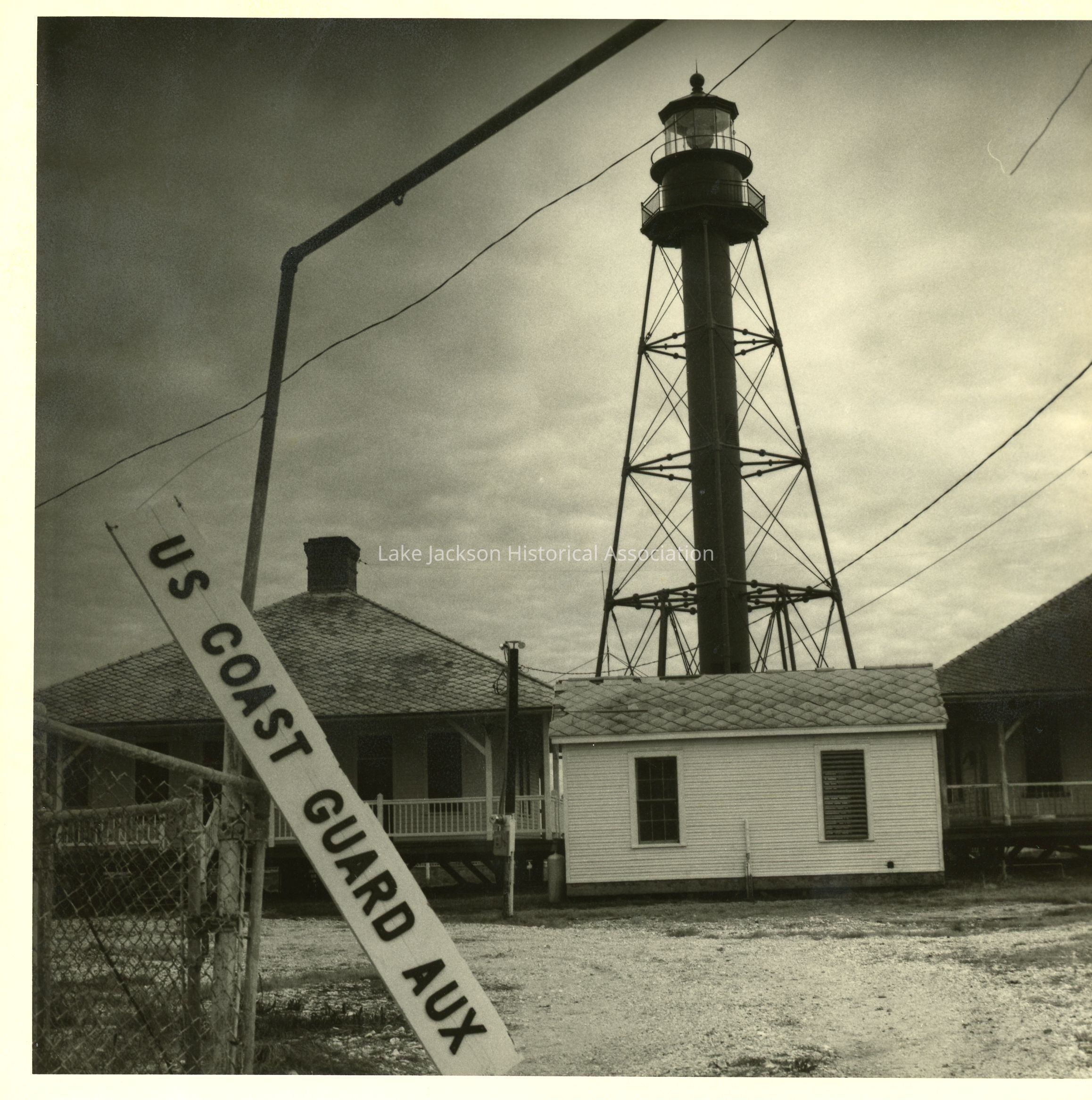 B/W photo of the Brazos River lighthouse deconstruction. The sign says, "US Coast Guard Aux".Collection