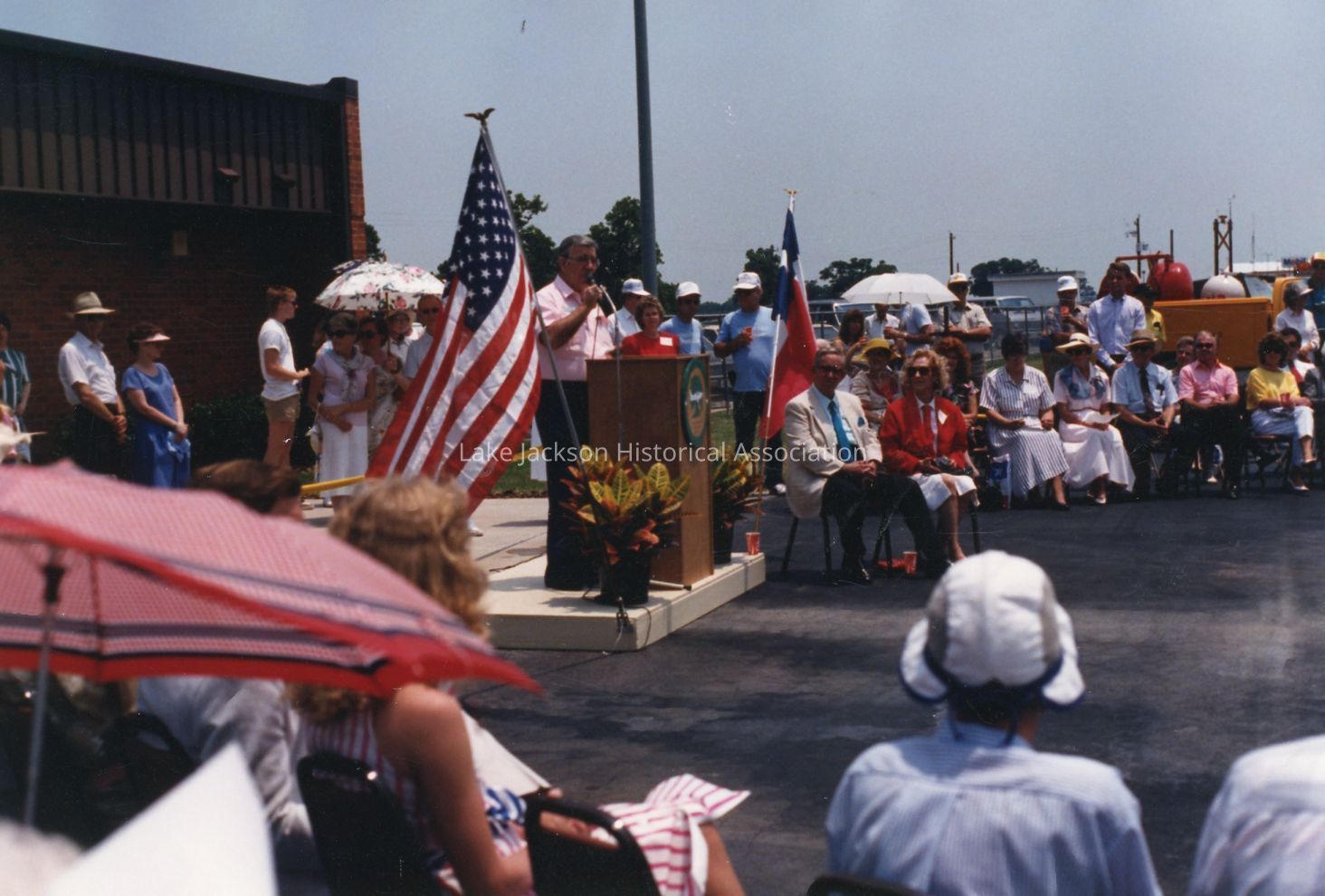 Color photo of a group at the Brazoria County Airport when the Windecker Eagle was formally donated to the Lake Jackson Historical Association.Collection