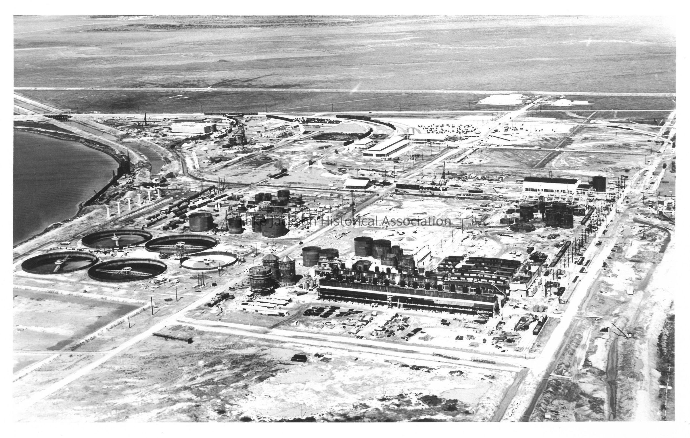 Close up aerial view of the Dow Chemical Company magnesium plant, Plant A in Freeport, Texas, 1940. In this picture the barracks and lunch hall are visible along with the dorr ponds and magnesium cells.Collection