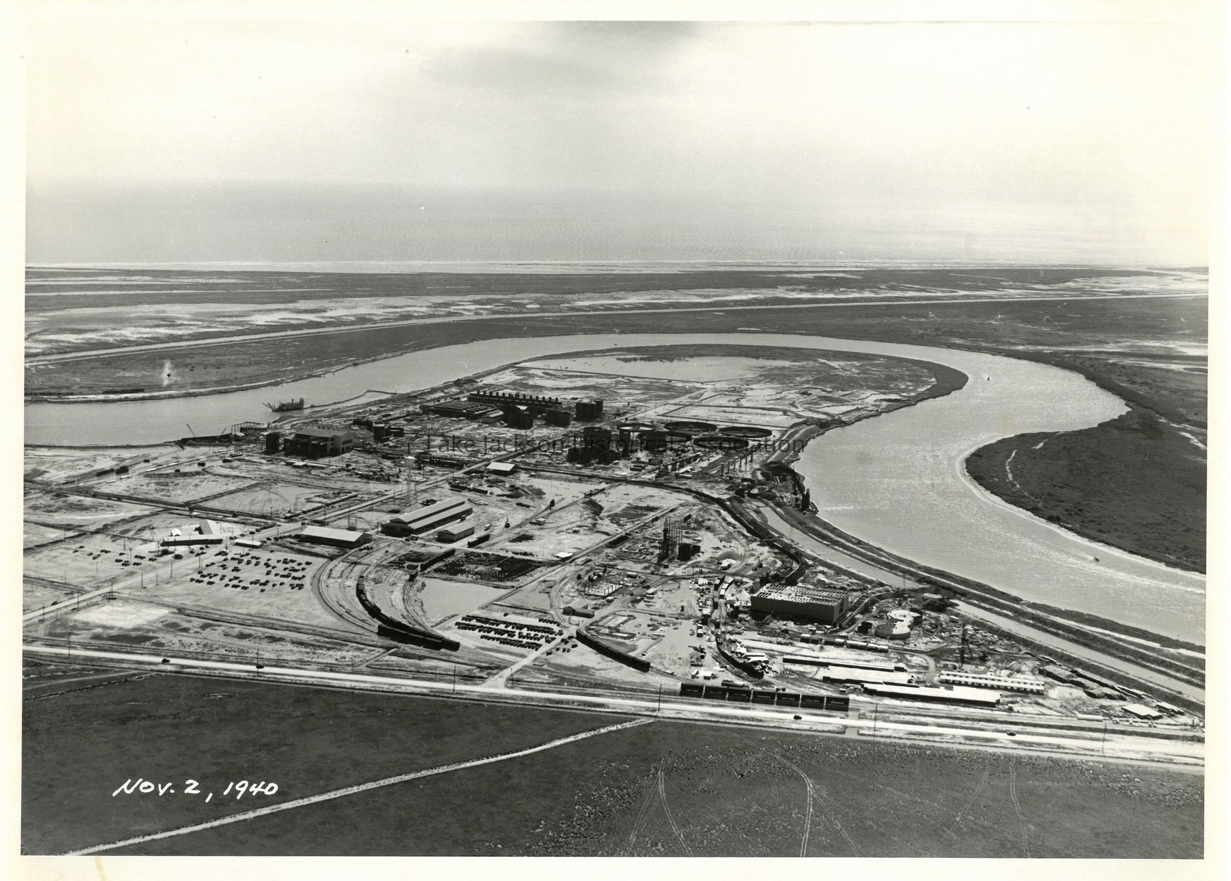 Aerial view of the Dow Chemical Company magnesium plant, Plant A in Freeport, Texas, November 2, 1940. In this picture the barracks and lunch hall are visible along with the dorr ponds and magnesium cells.-Collection