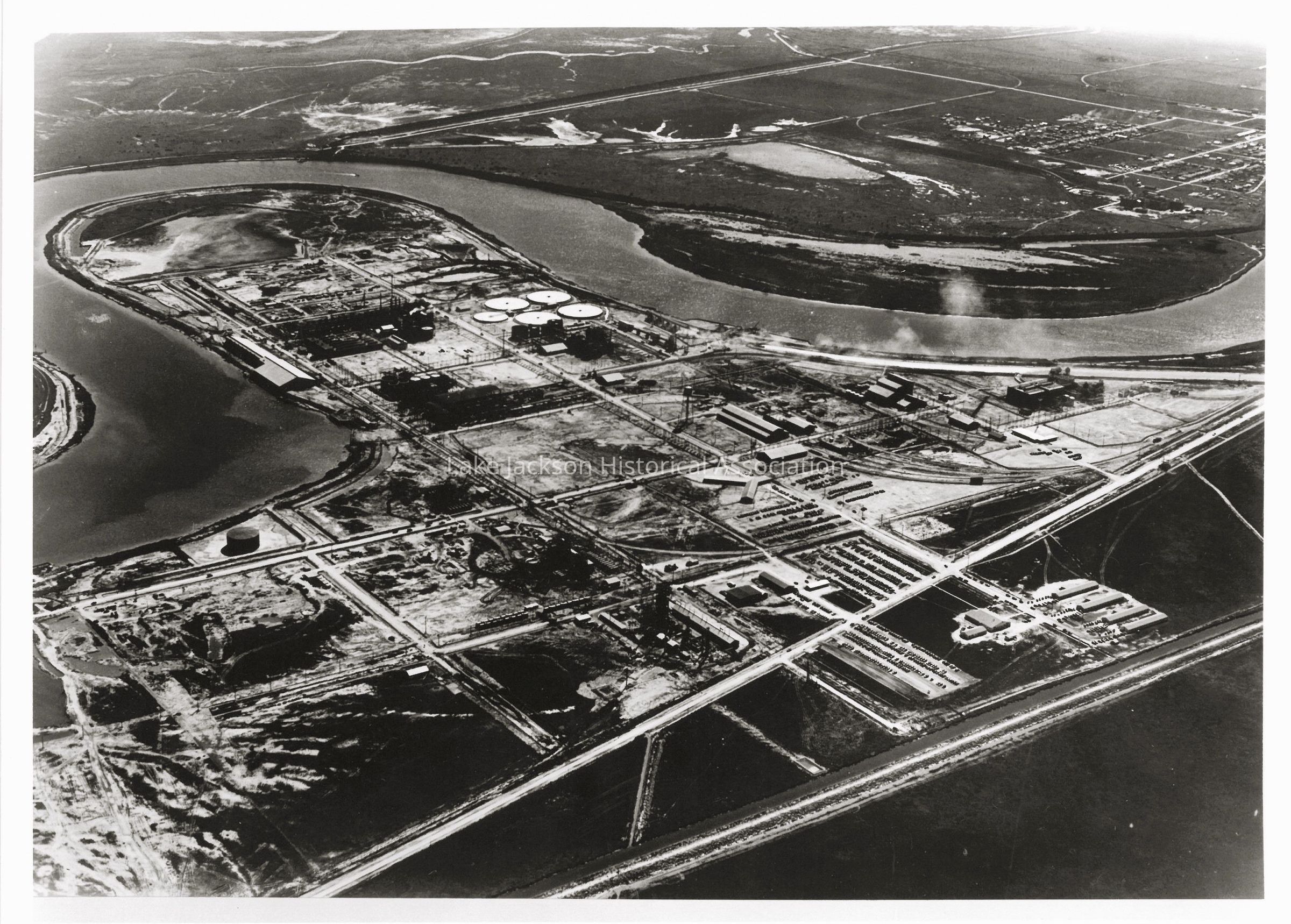 Aerial view of the Dow Chemical Company magnesium plant, Plant A in Freeport, Texas, 1940. In this picture the barracks and lunch hall are visible along with the dorr ponds and magnesium cells.Collection