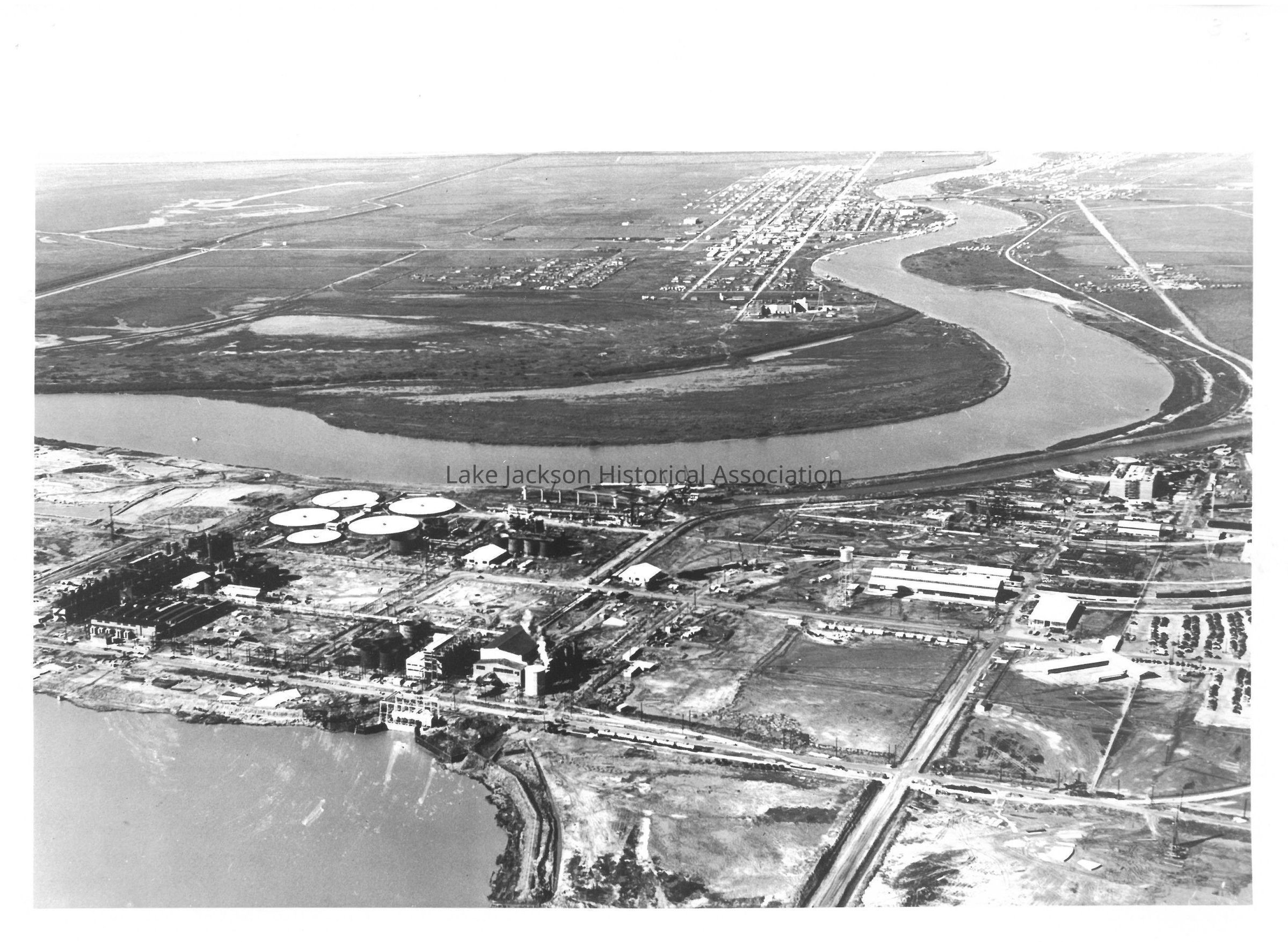 Aerial view of the Dow Chemical Company magnesium plant, Plant A in Freeport, Texas, 1940. In this picture the barracks and lunch hall are visible along with the dorr ponds and magnesium cells.Collection