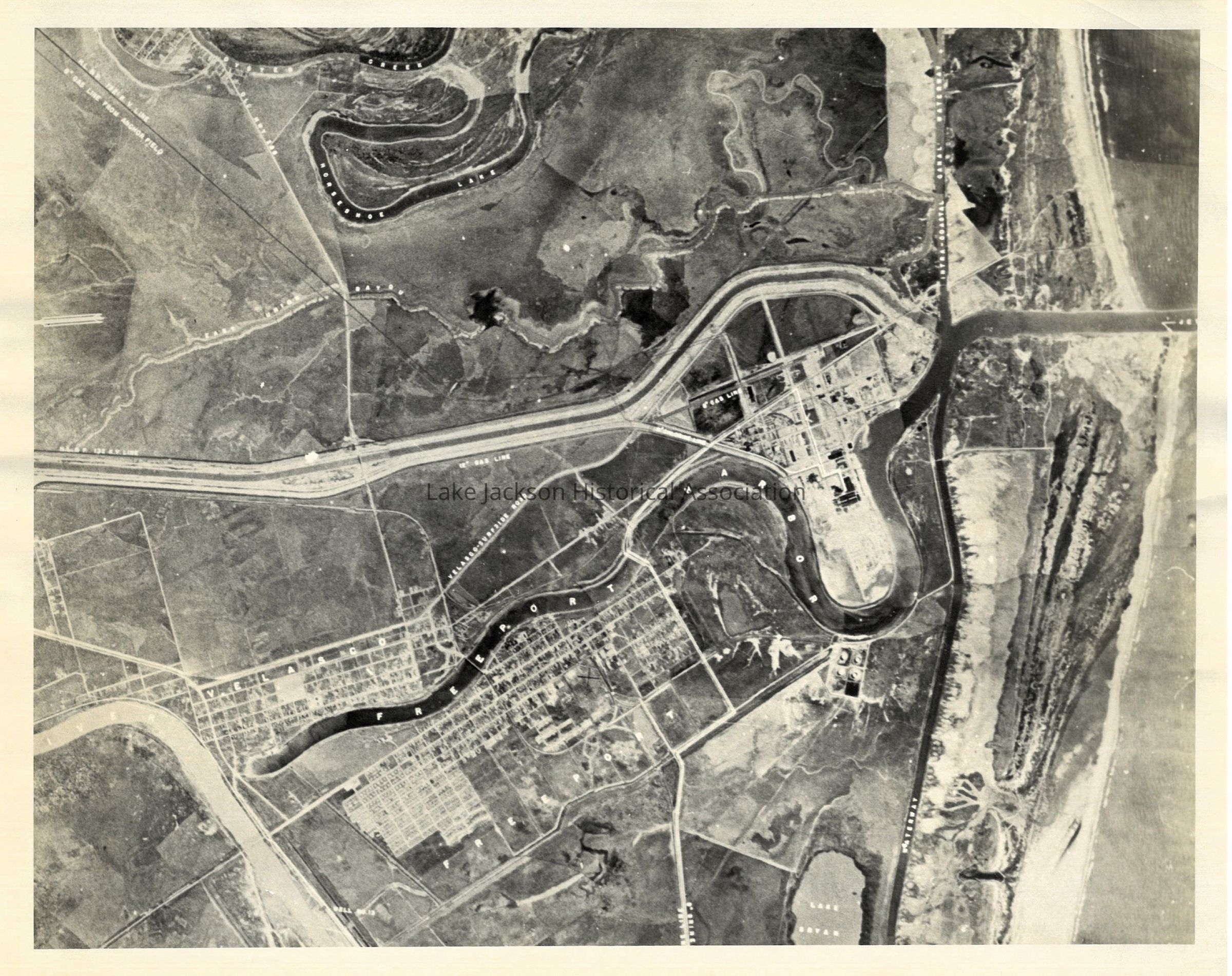 Aerial view of the Dow Chemical Company magnesium plant, Plant A in Freeport, Texas, 1942/1943. In this picture the barracks and lunch hall are visible along with the dorr ponds and magnesium cells. Also the Freeport/Velasco area.Collection