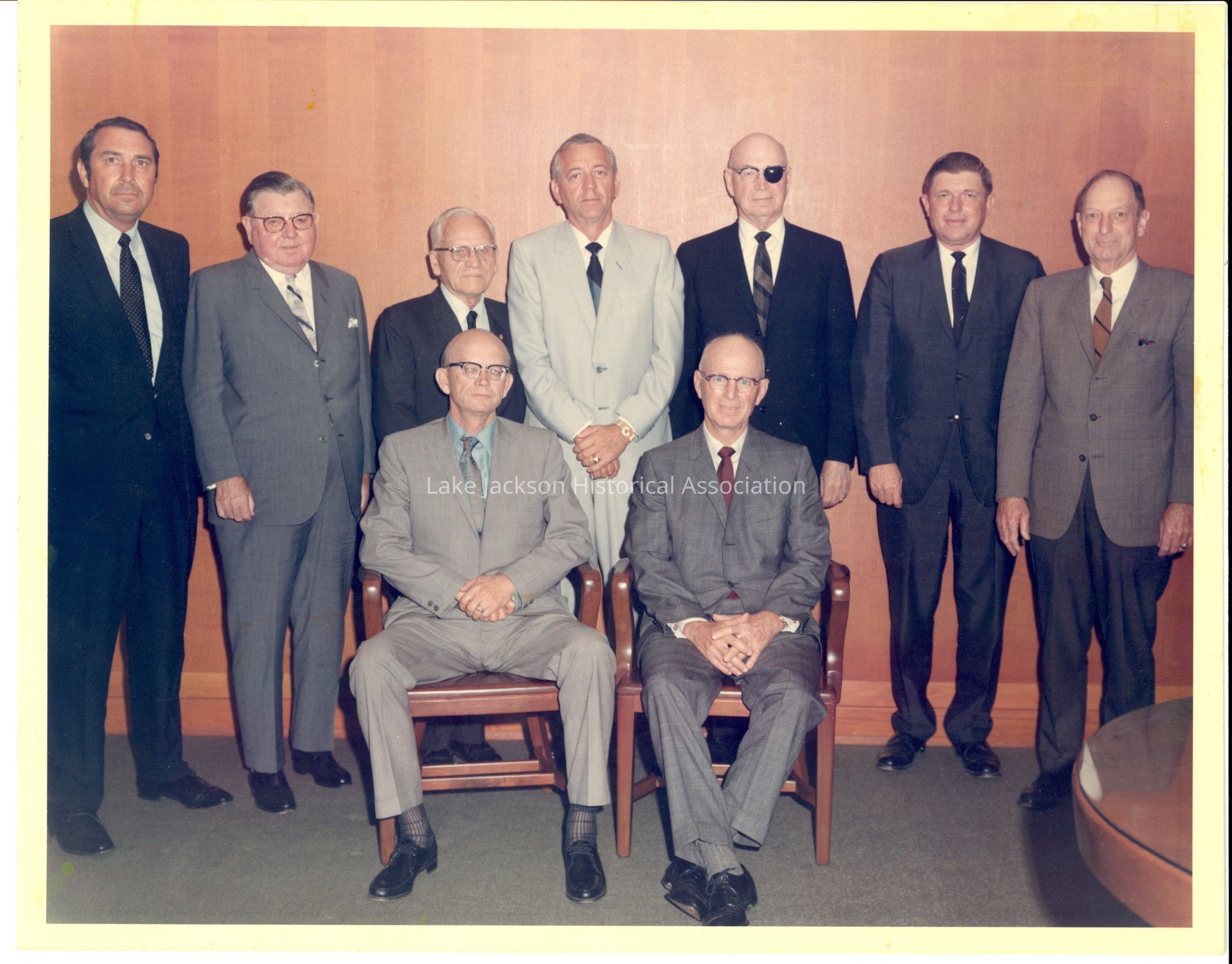 A color photo of a group of men. Seven men are standing, and two men are sitting in front of them. The third man standing from the left has a patch over his left eye.Collection