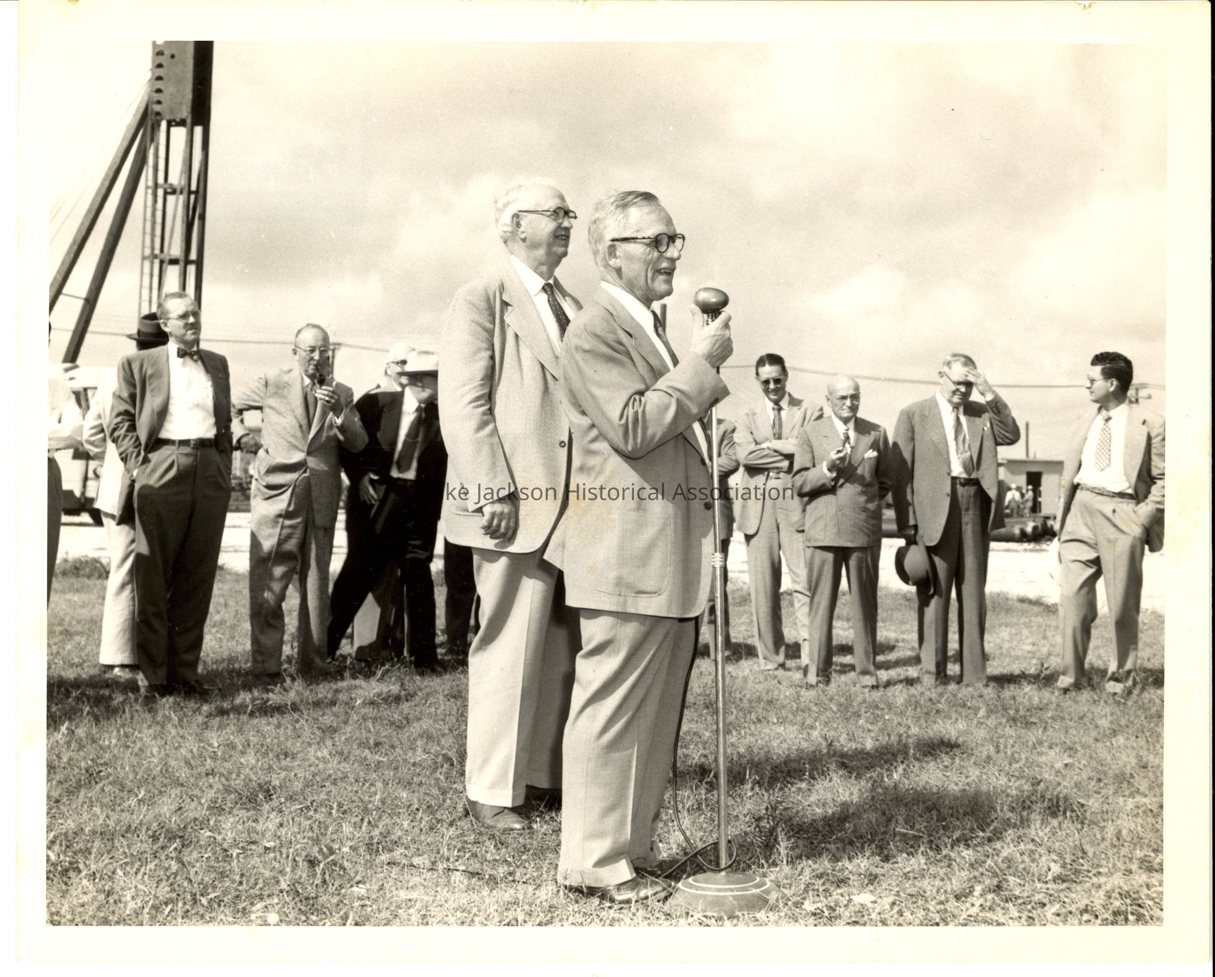 Black and white photo of Dr. Beutel at a microphone speaking to a group of men outside. Earl Barnes is included in the group of men.Collection
