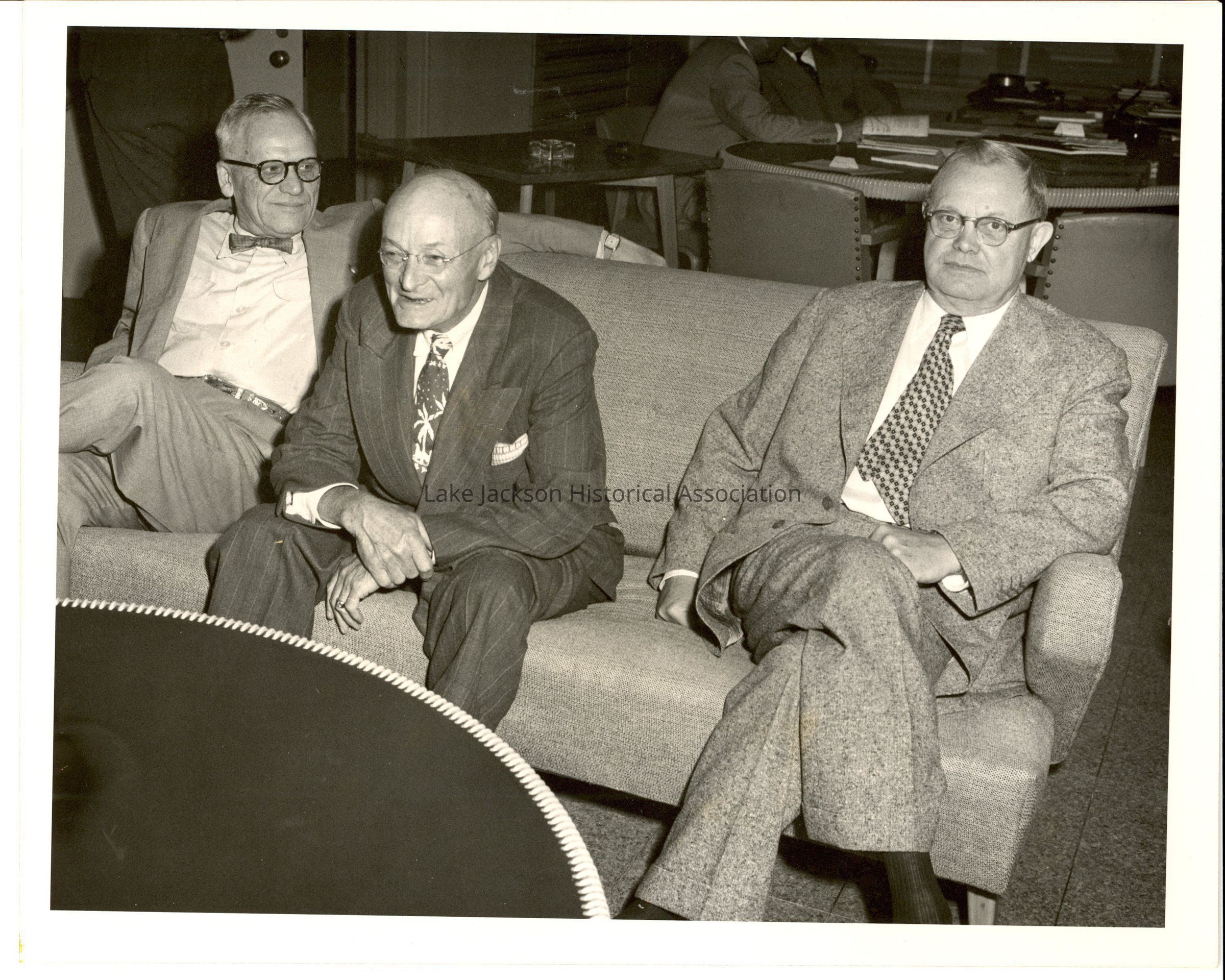 Black and white photo of Dr. Beutel sitting on the couch in his office with two other men. Both are members of the Dow Chemical Company Board of Directors. There are other men in the background.Collection
