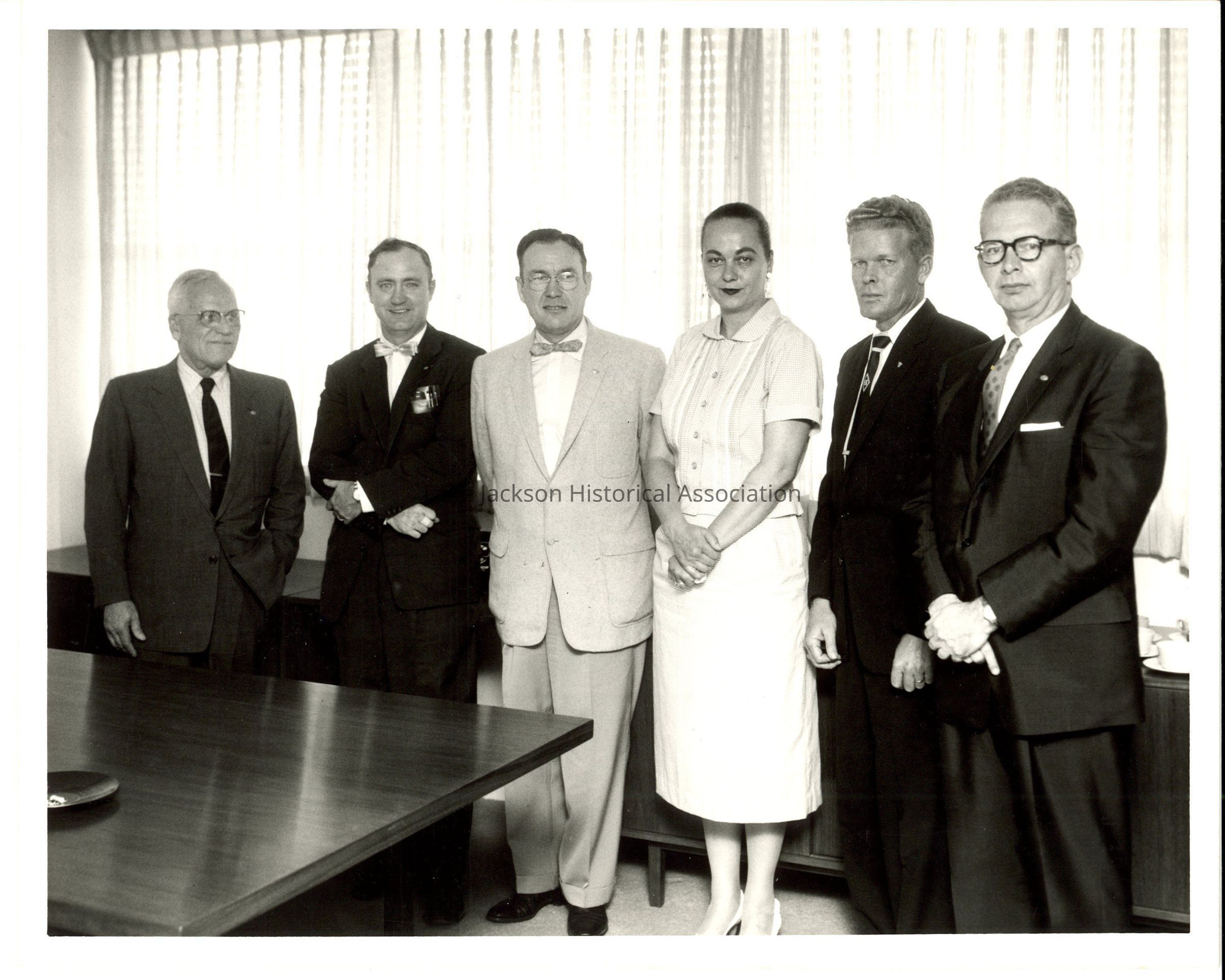 Black and white photo of Dr. Beutel with 4 men and 1 woman in an office. The back of the photo shows it may have been taken in Plaquemine, Louisiana.Collection