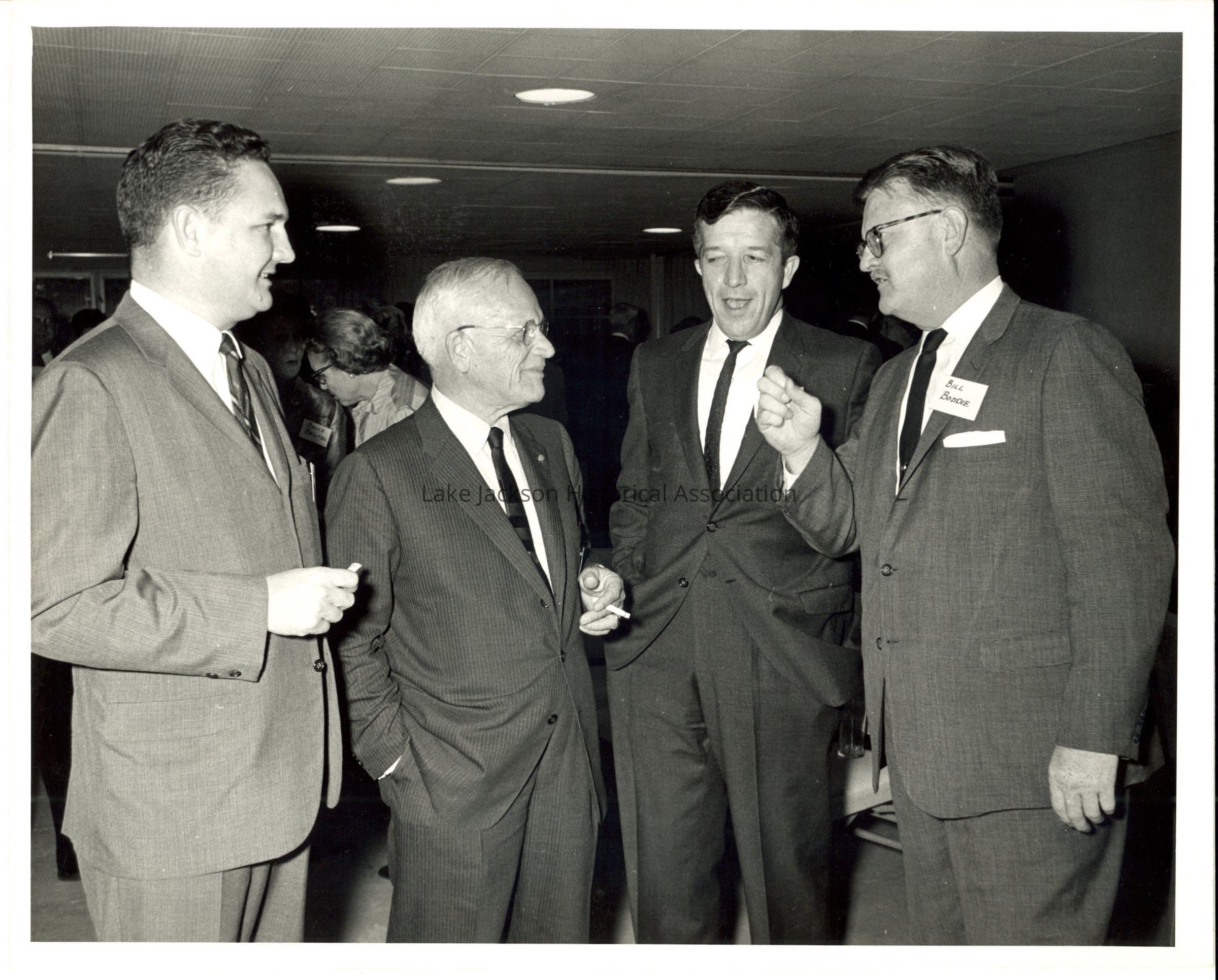 Black and white photo of Dr. Beutel with three other men. Belle Beutel is standing in the background. Dr. Beutel is talking to Bill Boddie.Collection