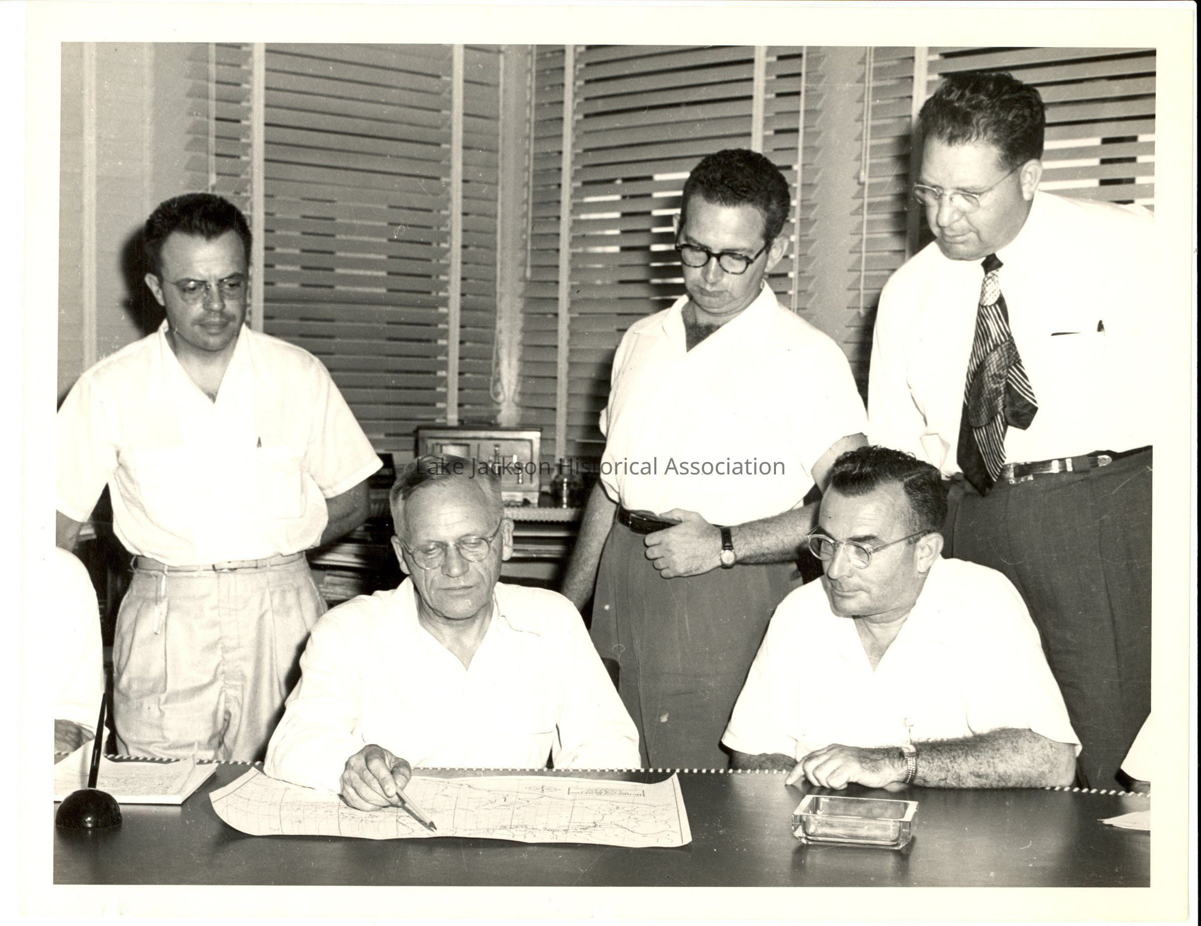 Black and white photo of Dr. Beutel in his office with 4 other men. Dr. Beutel is looking at a map.Collection