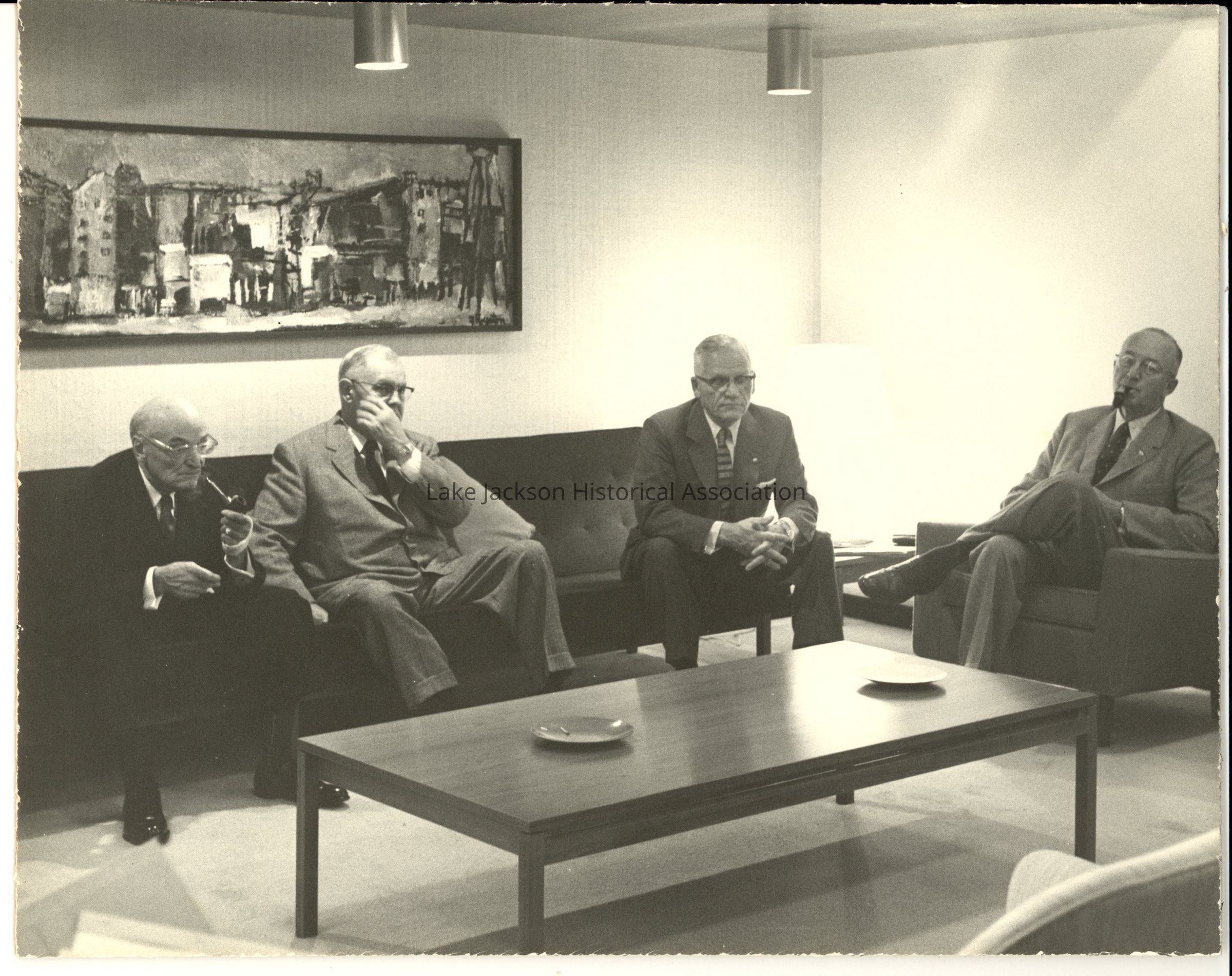 Black and white photo of Dr. Beutel in his office with three other members of the Dow Chemical Company Board of Directors. The painting on the wall behind them is a part of the museum's collection.Collection