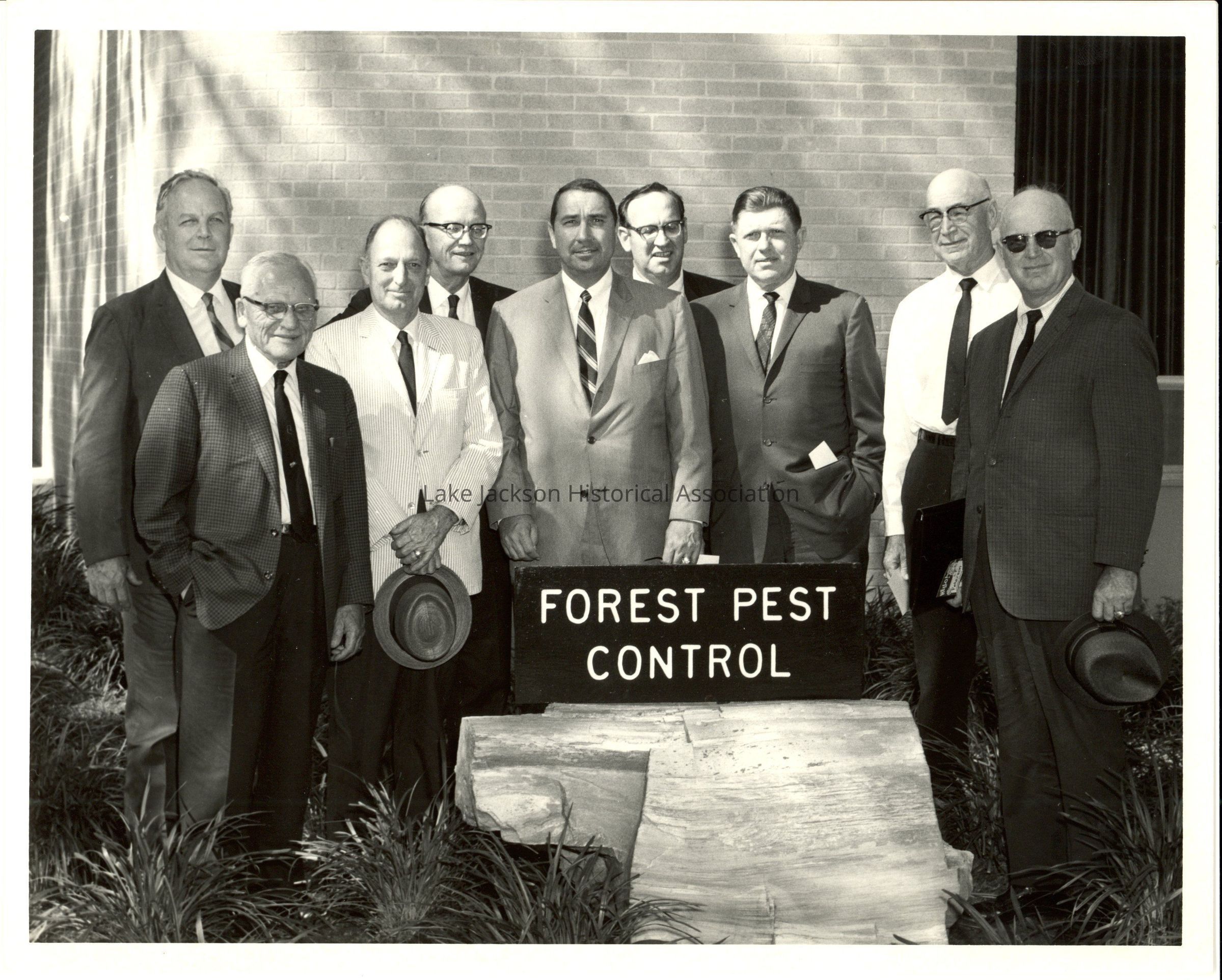 Black and white photo of Dr. Beutel with a group of men. They are standing in front of a building, behind a sign that says, "Forest Pest Control".Collection