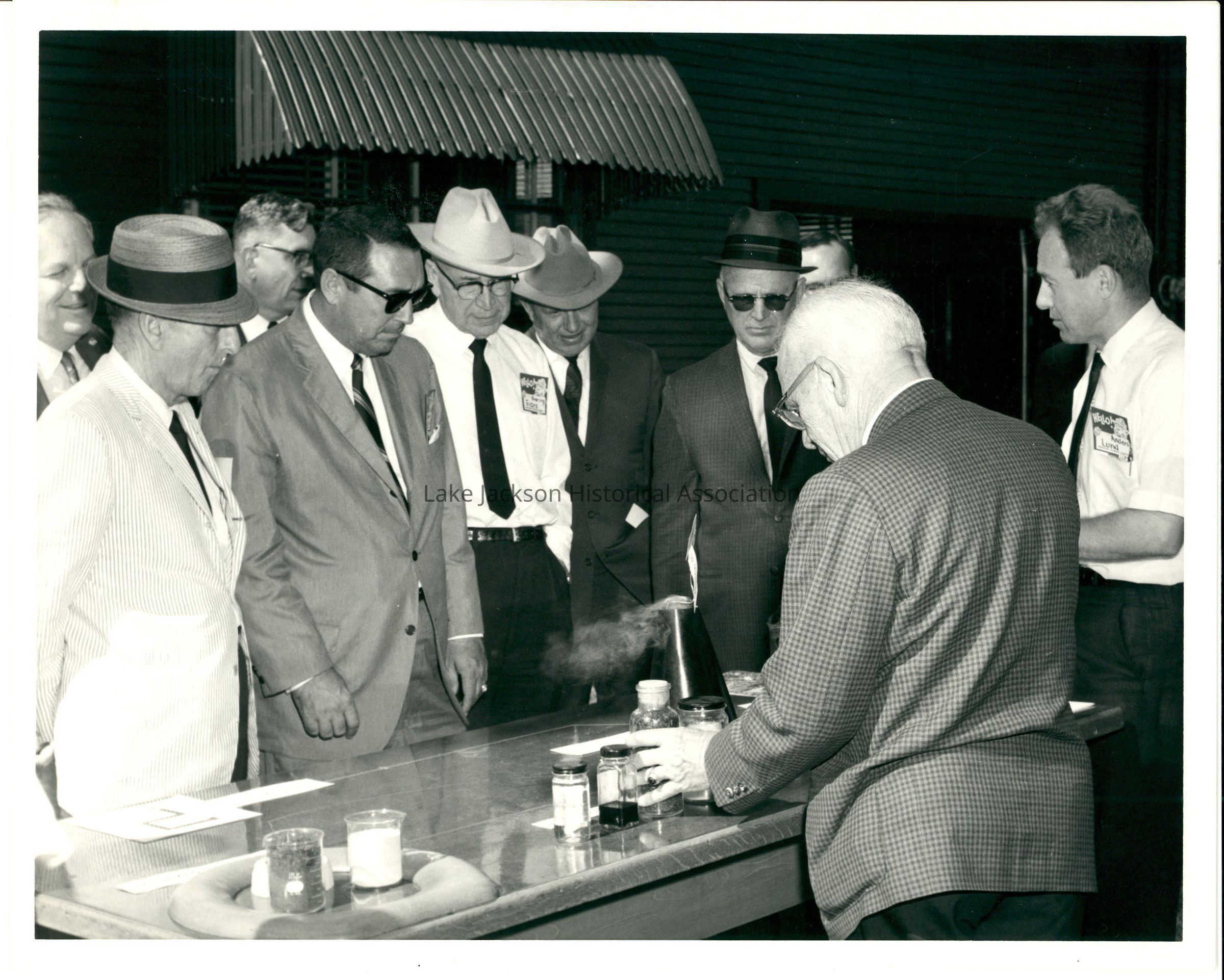 Dr. Beutel is standing at a counter with jars of chemicals in front of him. Men are gathered in front of him. Anders Lund is standing to the right of Dr. Beutel.Collection